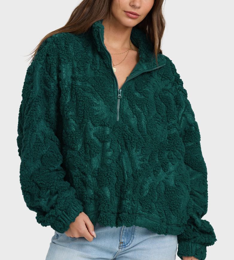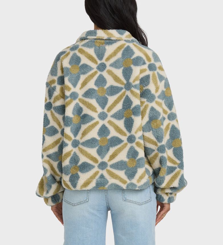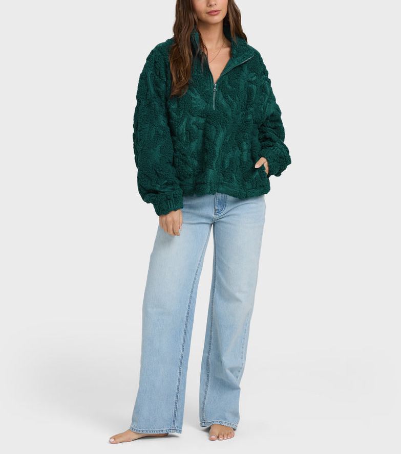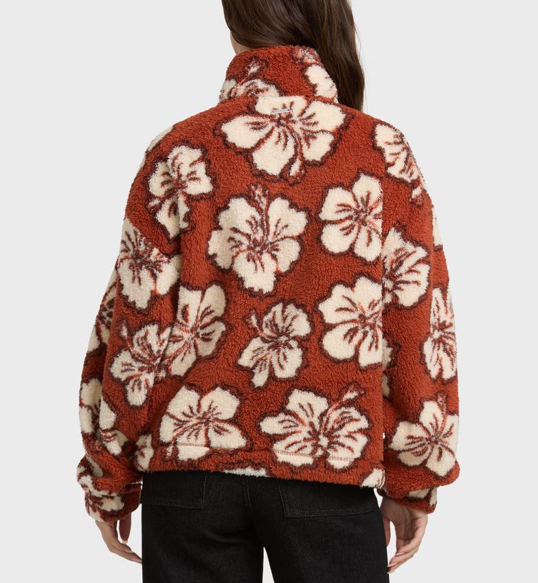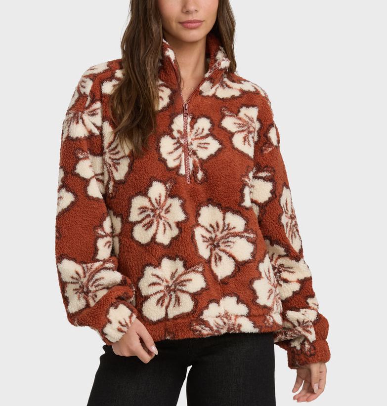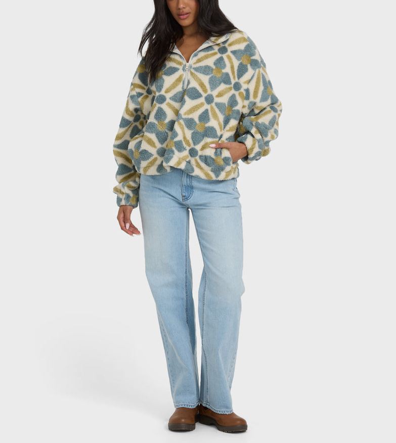 This cozy sherpa half-zip brings laid-back luxury to chilly days. The relaxed fit and all-over print make it perfect for everyday wear, while side pockets and elastic sleeves add practical comfort.