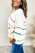 Effortlessly chic, this sweater combines classic elegance with modern comfort for a versatile wardrobe staple. The trendy striped pattern will surely make heads turn. The baggy fit makes it super comfy to wear all day long. It’s incredibly versatile and goes perfectly with jeans, leggings, or skirts.