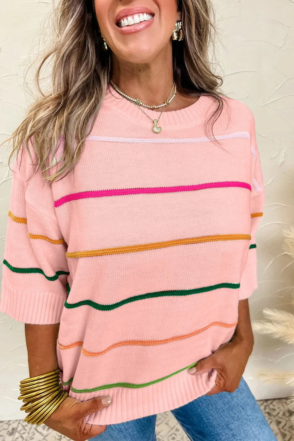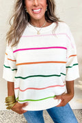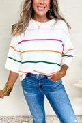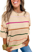 Women's Knitted Half Sleeved Striped Shoulder Sweater