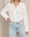 This women's lace blouse, crafted from sheer floral lace, perfectly blends sophistication and sensuality. Ruffled button cuffs add a touch of playfulness without sacrificing vintage flair.