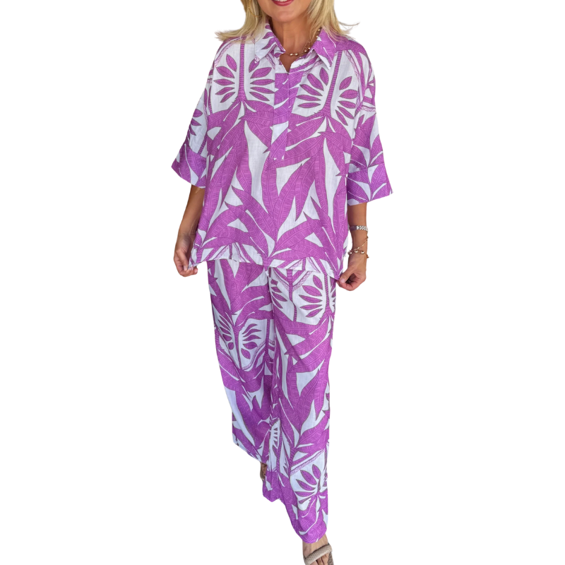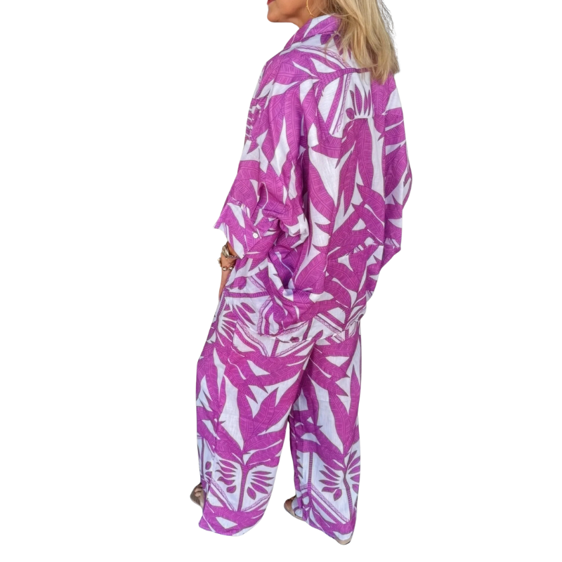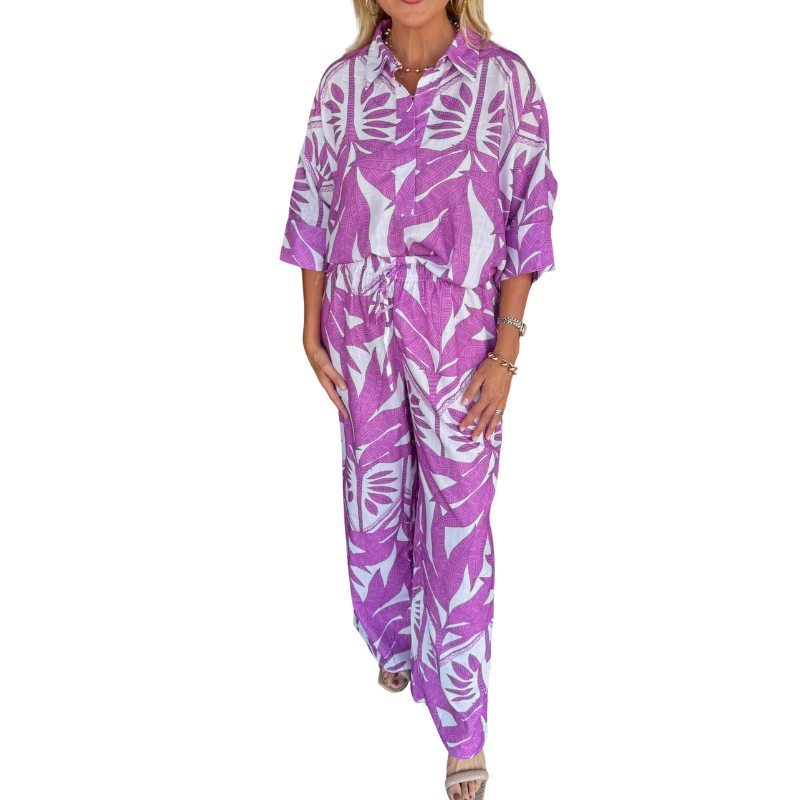 This playful two-piece includes a chic top and matching pants, perfect for mixing comfort with style.