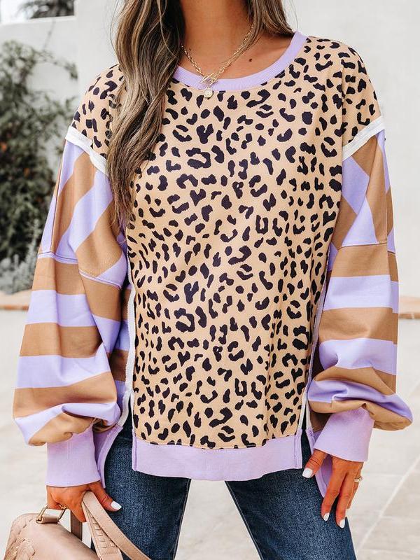 This trendy sweatshirt combines several chic elements is worth to have. It features a leopard silhouette with striped colorblock sleeves. ·Oversized fit with side slits are comfy to get a casual slim look.