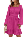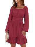 Womens Long Lantern Sleeve Square Neck Elastic Waist Ruffle Flowy Swing A-Line Short Dresses