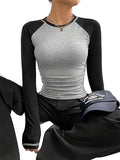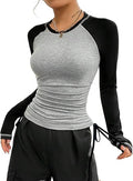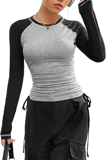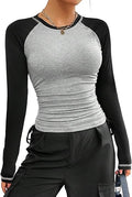 Women's Long Sleeve Raglan T Shirt Color Block Tee Drawstring Side Ruched Top