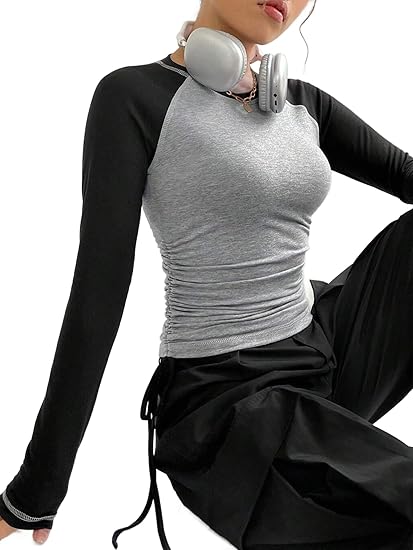 Long sleeve top featured with seam design, round neck, slim fit, raglan sleeve tops for women, side ruched tops for women, side adjustable drawstring design. Ruched tops for women is suitable for daily life, work, office, outdoor, school, party, night out, street wear, holiday, going out.