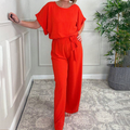 Womens Loose Short Sleeve Belted Wide Leg Pant Romper