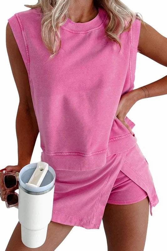 Introducing our two piece summer outfit, featuring a comfortable mineral washed skort and sleeveless top. With a round neck and versatile design, this outfit is perfect for pickleball, running errands, or just out shopping. Look stylish and feel comfortable all summer long!