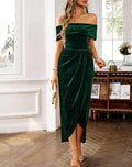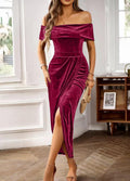 Elevate your evening attire with this women's velvet dress, featuring an off-shoulder neckline, high waist, figure-defining silhouette, and elegant slit for refined allure.
