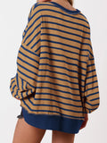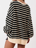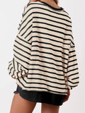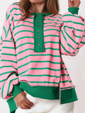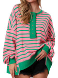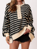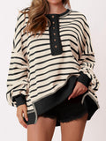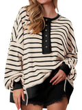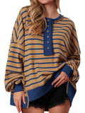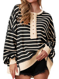 Women's Oversized Striped Button Up Henley Neck Waffle Knit Pullover