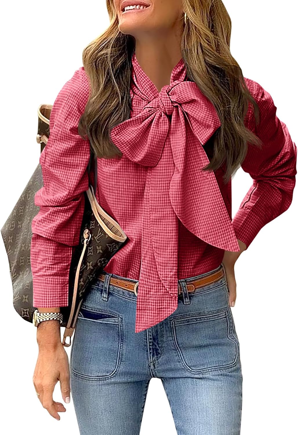 Womens Plaid Shirts Bow Tied Neck Button Down Long Sleeve Blouse Tops