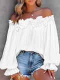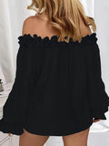 Elevate your look with this off‑shoulder ruffle top—crafted from an airy, flowy fabric that drapes beautifully and keeps you feeling light all day. Delicate ruffles frame the neckline, while billowy sleeves add a romantic, free‑spirited vibe.