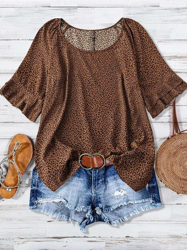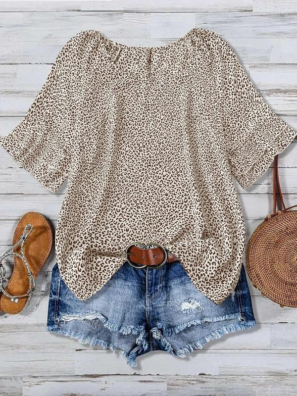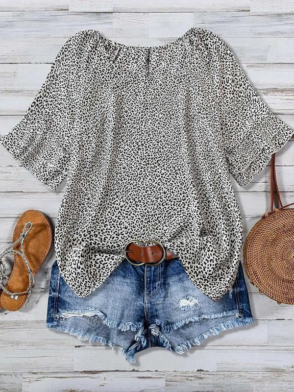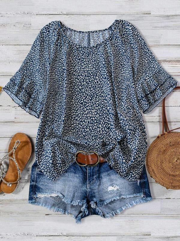 The classic round neckline adds elegance, while the ruffled bell sleeves frame the perfect arm curves. These design elements add a touch of femininity and elegance, making this women's printed shirt a fashionable choice.