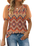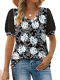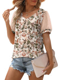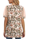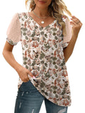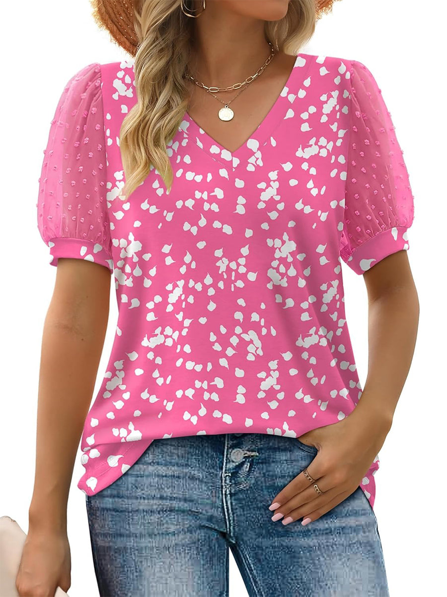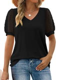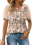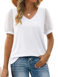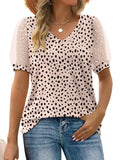 Women's Printed V Neck Swiss Dot Puff Sleeve Loose Casual T-Shirt