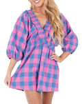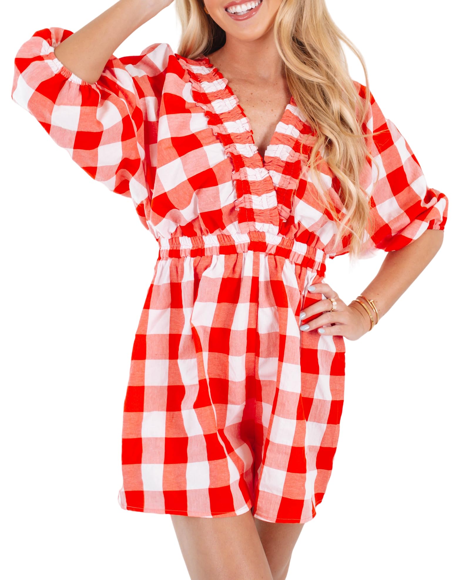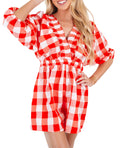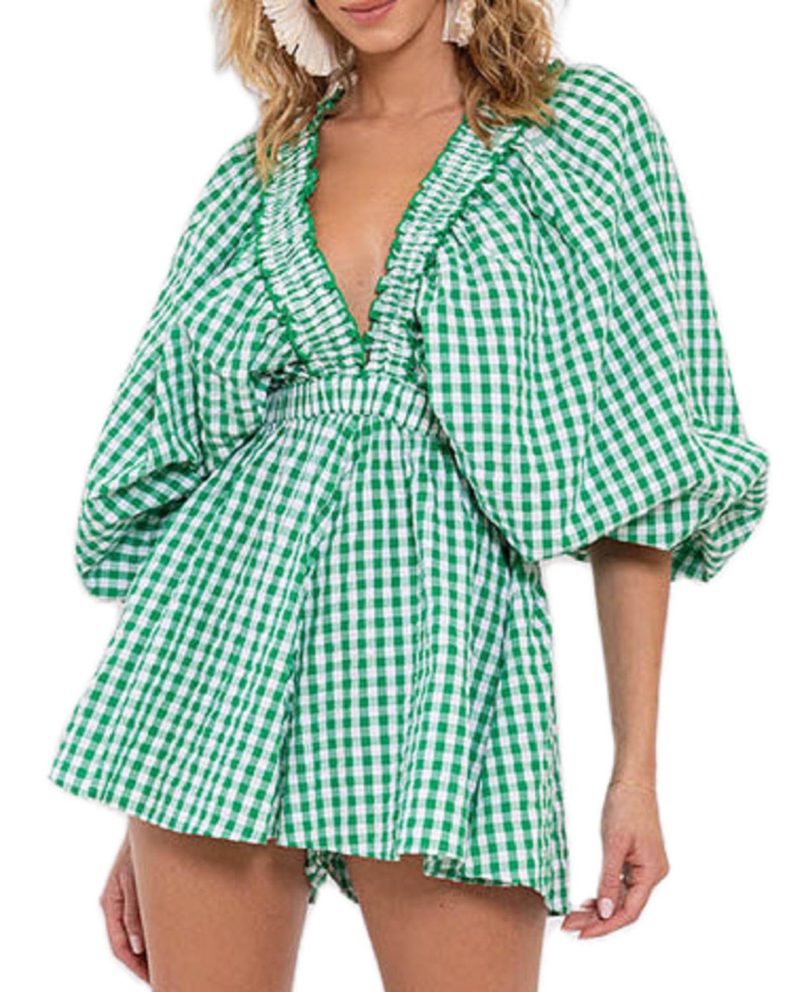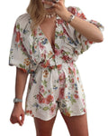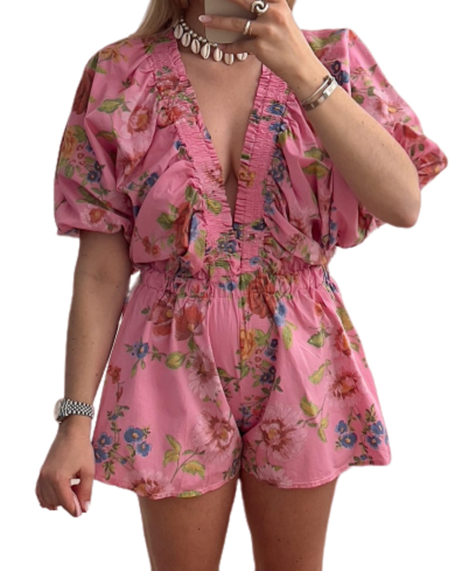 Women's Puff Sleeve Bodysuit Deep V Neck Printed Jumpsuit