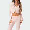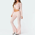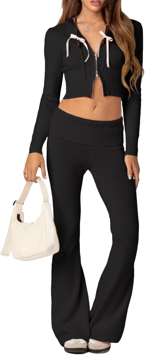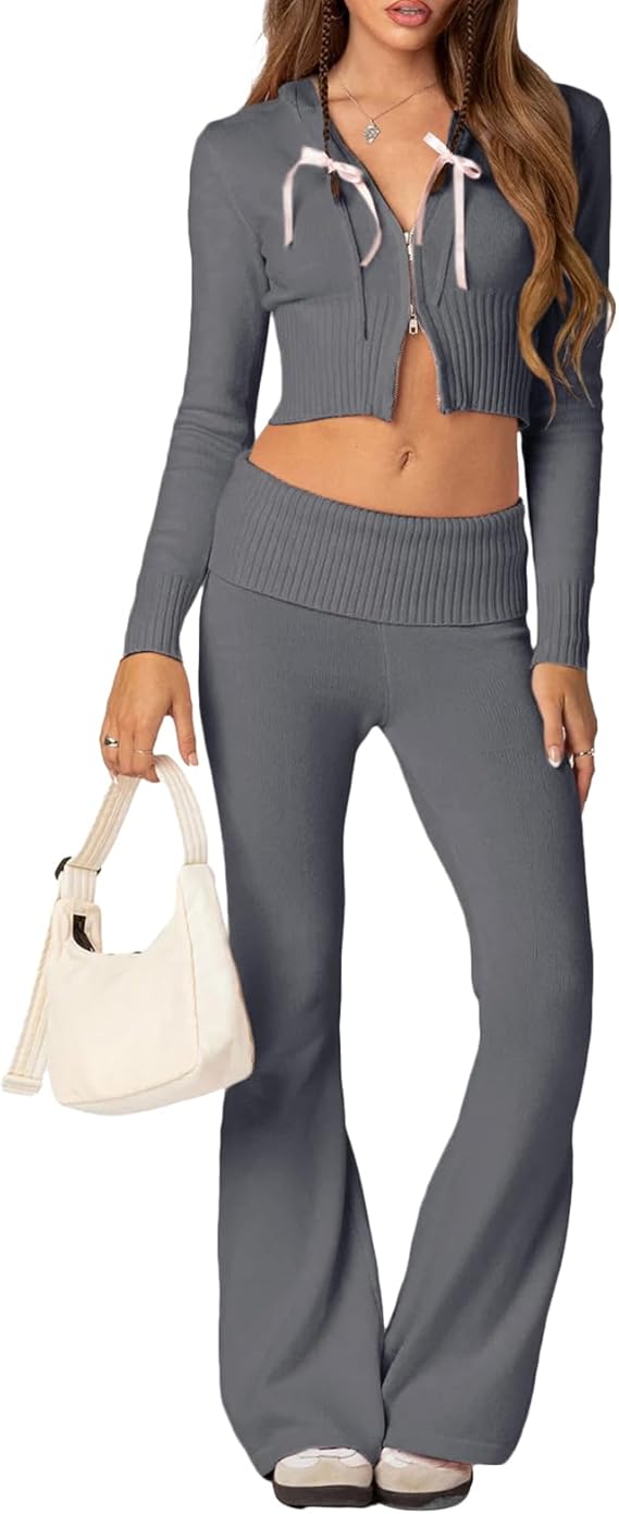 Women's Ribbed Knit Outfits Long Sleeve Zip Up Hooded Sweater Set