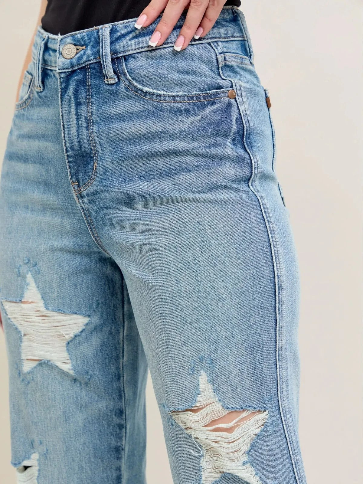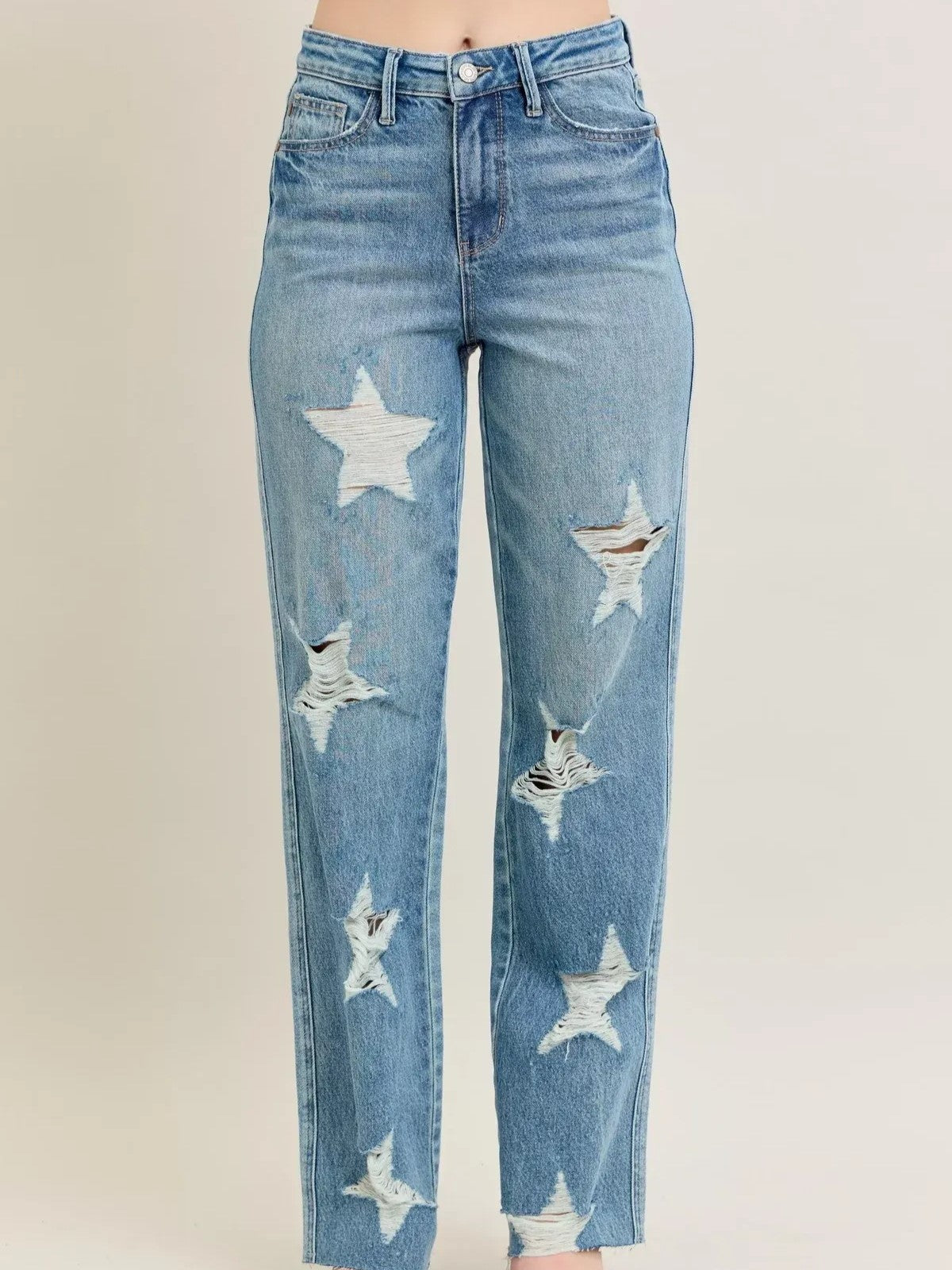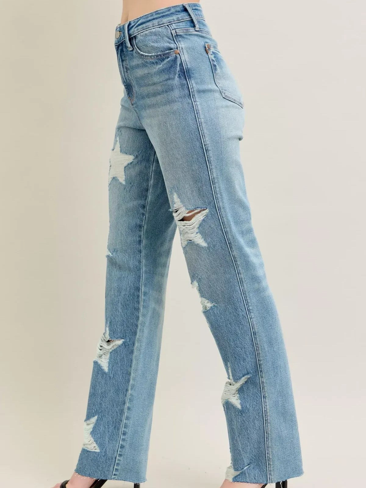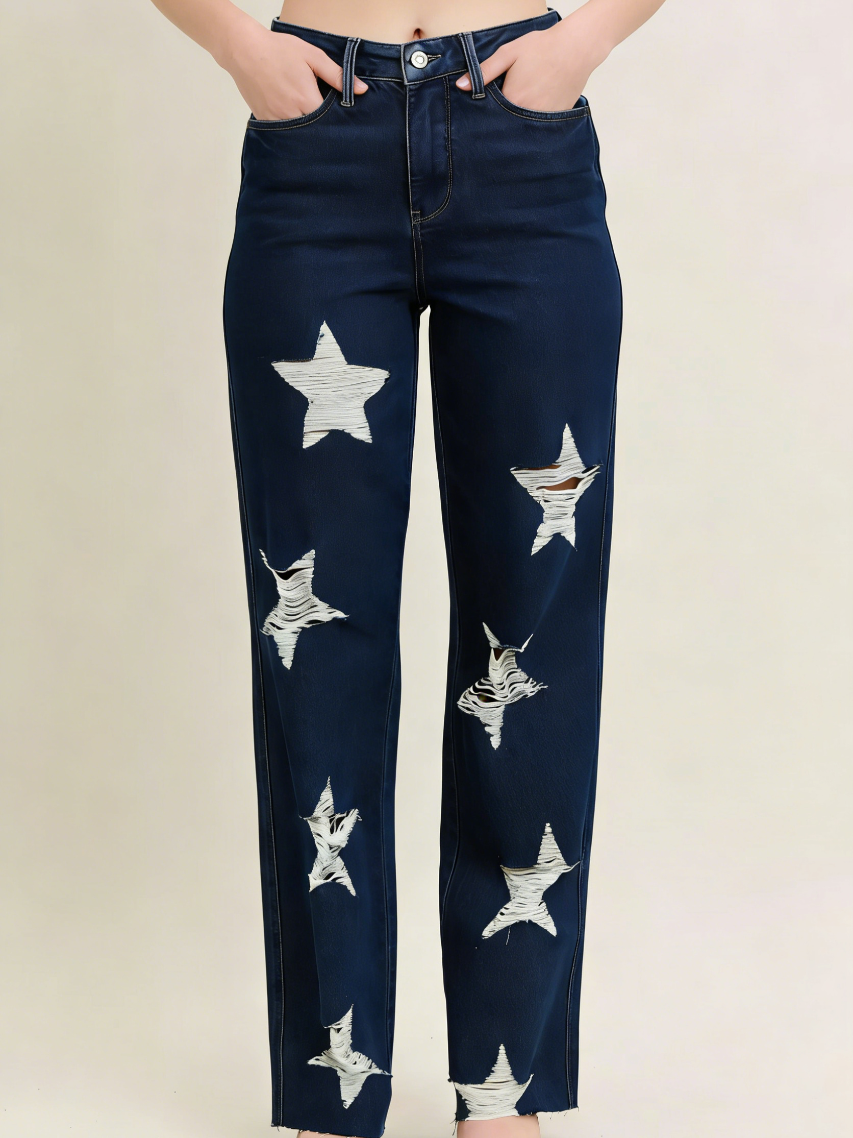 Ready to chase your inner cowgirl dreams? Throw on these Women's Ripped Star Pattern Straight-Leg Denim Pants and outshine the wild west—or at least your friends. With trendy worn stars and flattering fit, you’ll be the coolest !