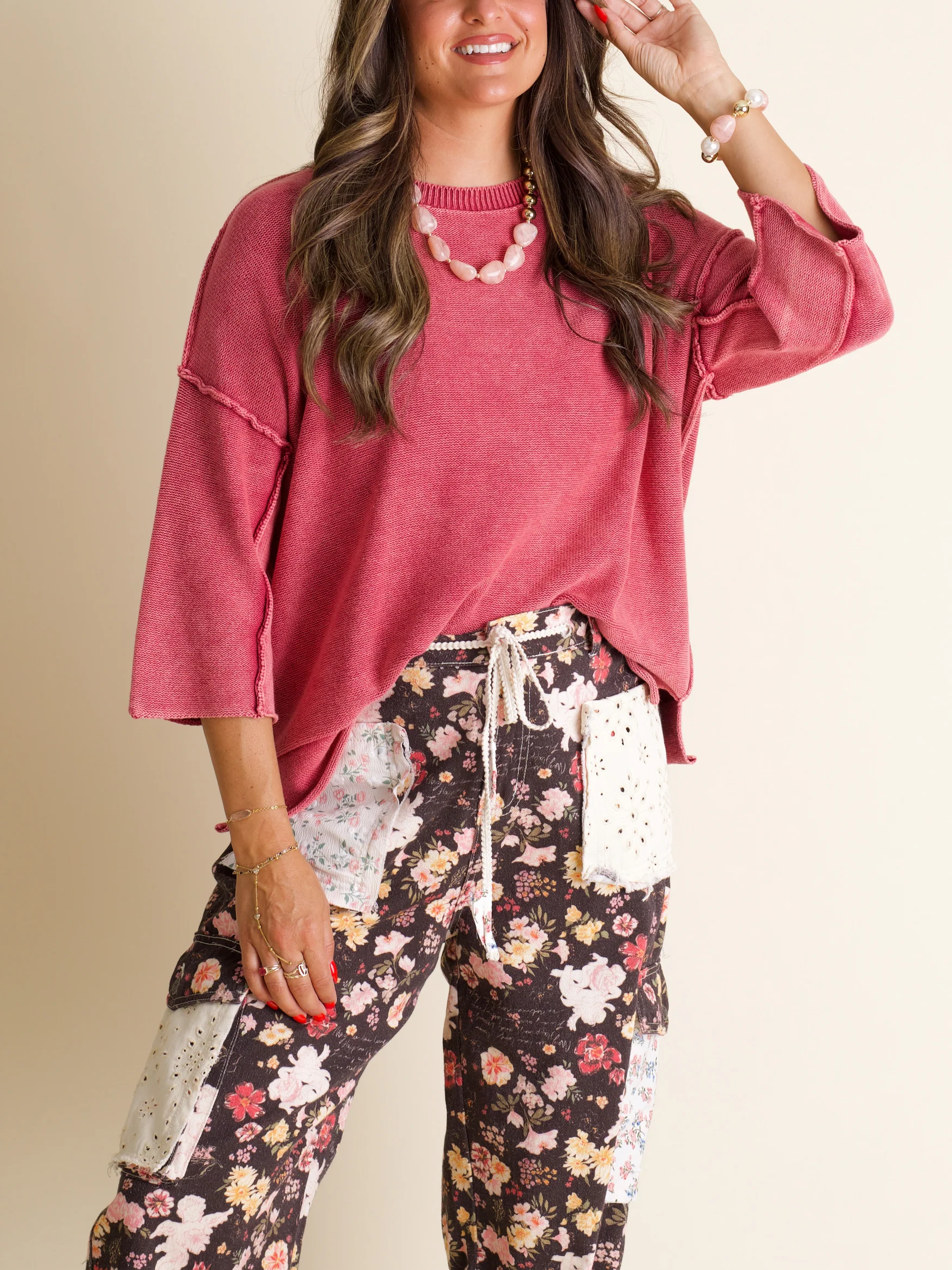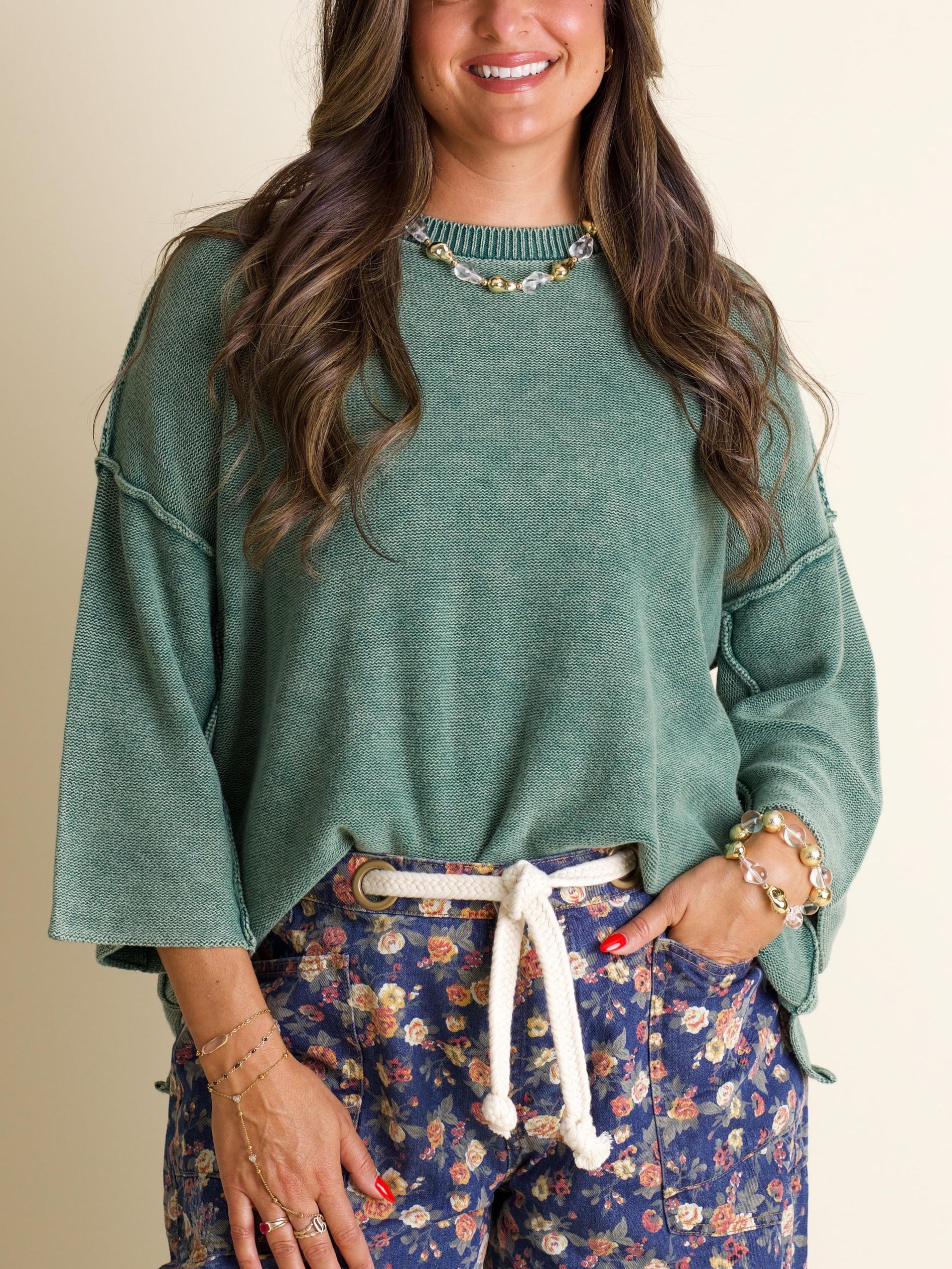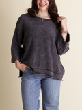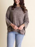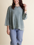 Get cozy with the Washed Sweater! Featuring a fun acid wash and dolman quarter-length sleeves, this sweater brings relaxed vibes with its raw edge seams and ribbed trim. Perfect for layering or lounging, it’s your go-to for effortless style and comfort.