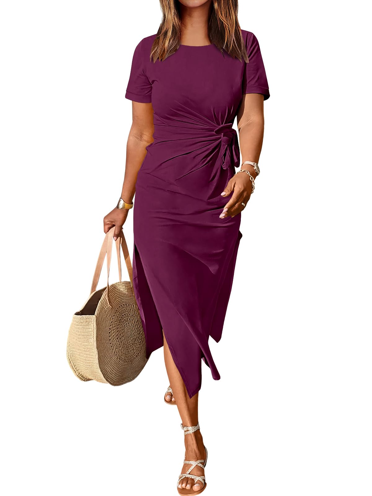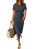 Elevate your wardrobe with the Short Sleeve Crewneck Tie Waist Split Dress, featuring a flattering tie waist and elegant split detail. Designed for both comfort and style, this versatile dress transitions effortlessly from day to night.