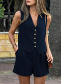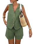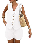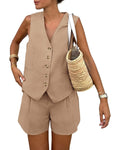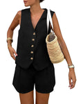 Women's Sleeveless Button V-Neck Vest Shorts Two-Piece Set with Pockets