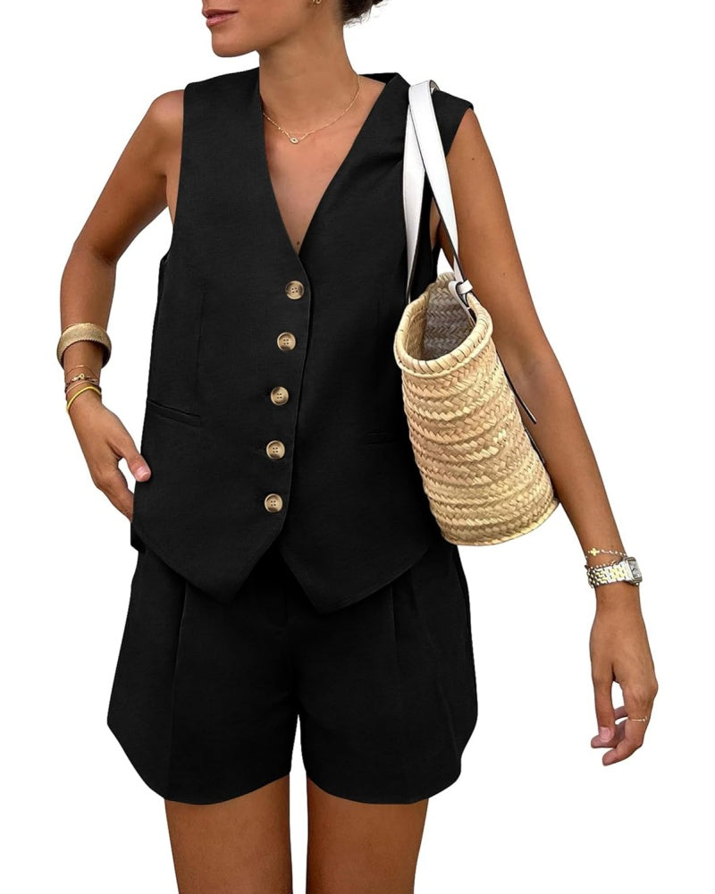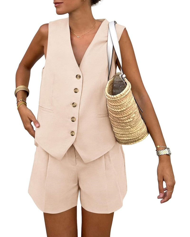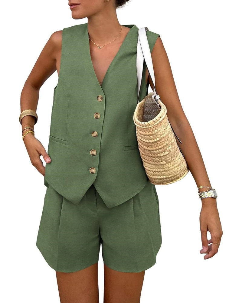 Elevate your wardrobe with this sleeveless button V-neck vest and shorts two-piece set. Thoughtfully designed with convenient pockets, this chic ensemble seamlessly combines style and functionality for a polished, modern look.