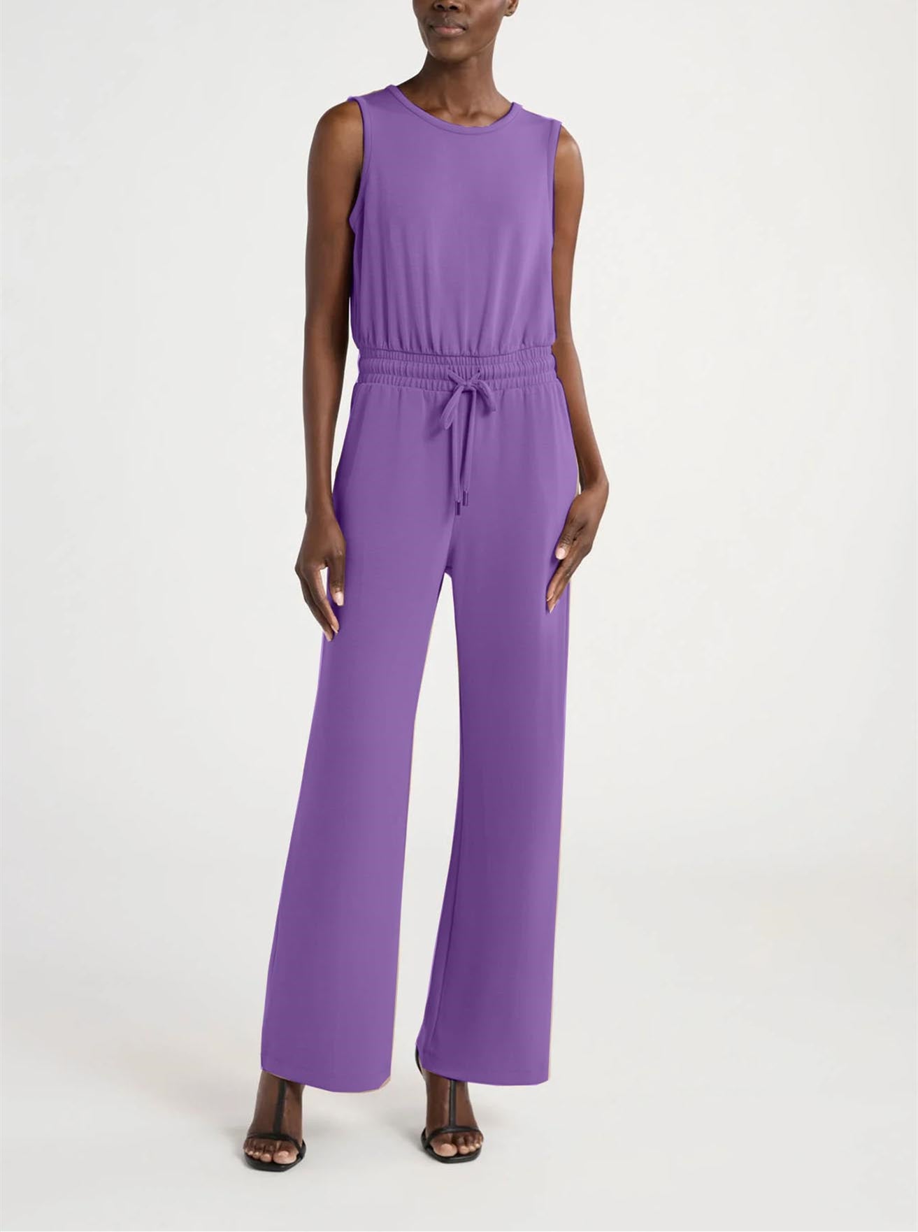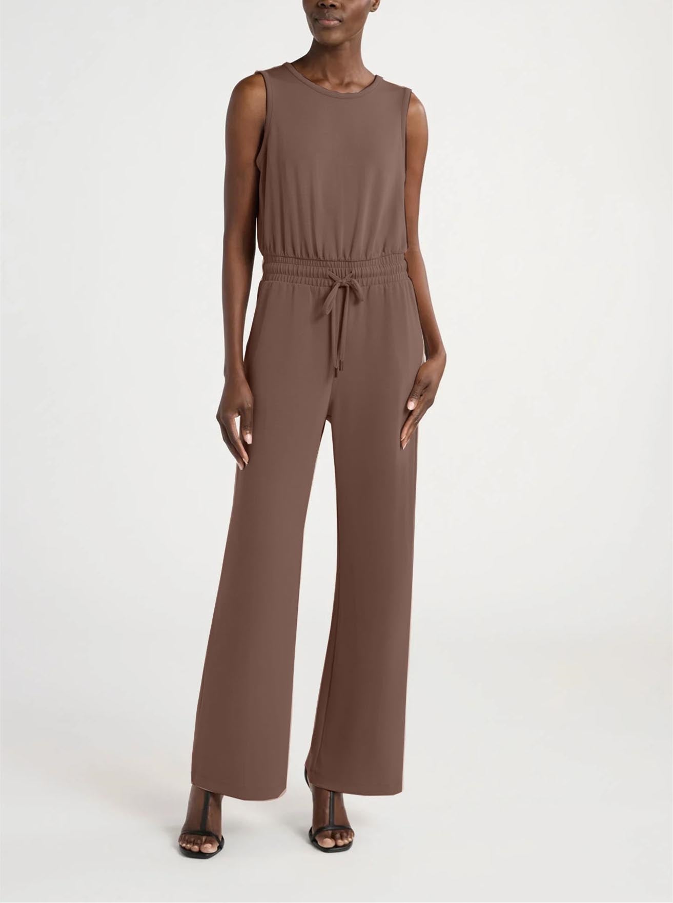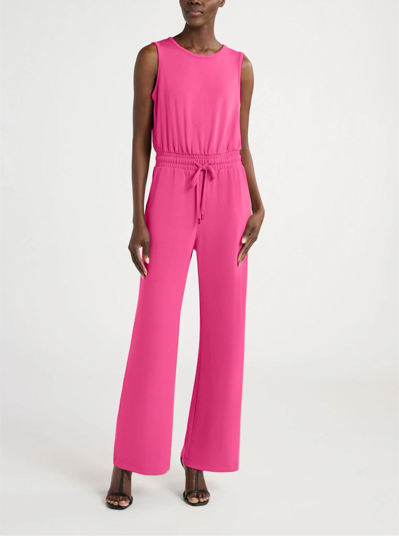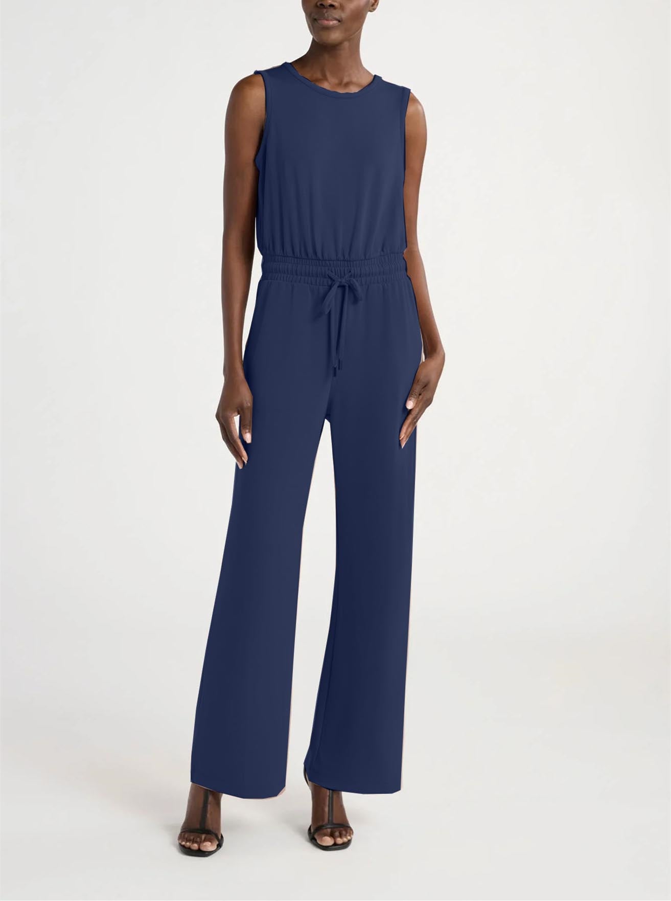 Our wide-leg jumpsuit is made from a modern, on-trend fabric that's smooth and slightly stretchy, offering the perfect blend of comfort and style. The sporty design features a drawstring waistband for a custom fit. The sleek wide-leg silhouette creates a sleek, modern look that can be worn casually or dressy.