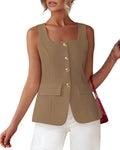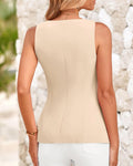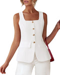 Elevate your wardrobe with the Square-Neck Button-Sleeveless Suit Vest. Featuring a modern square neckline and button detailing, this versatile vest offers effortless style for any occasion.