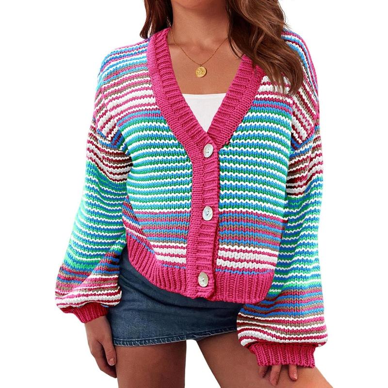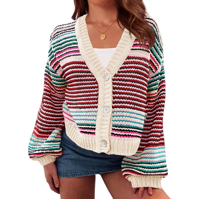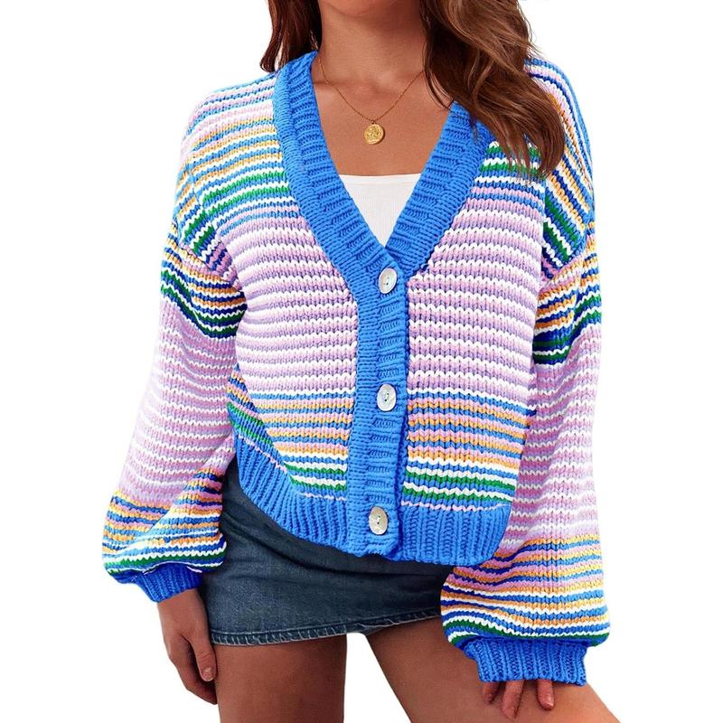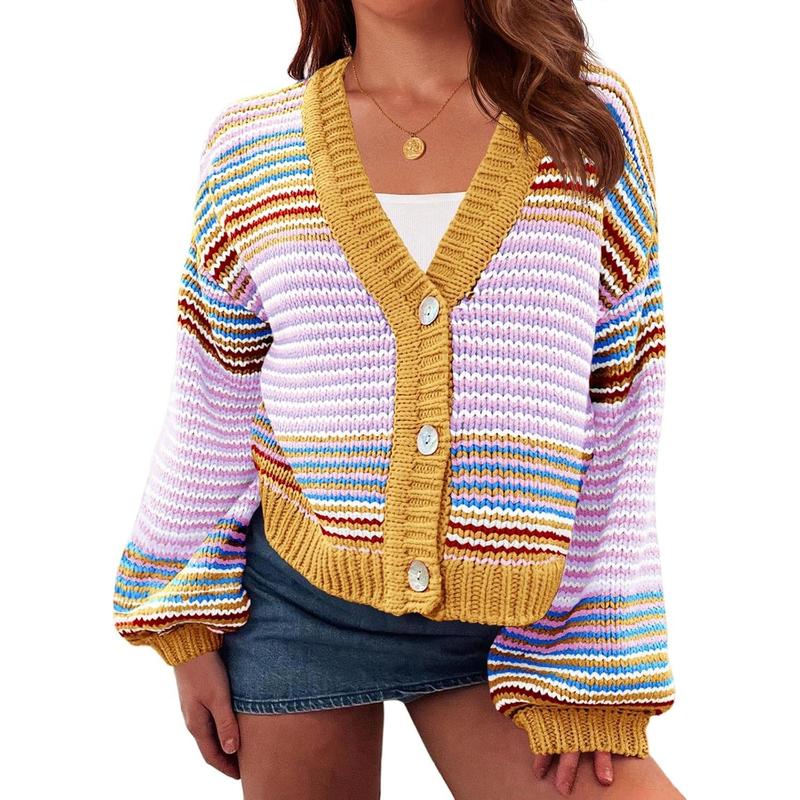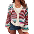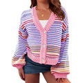 Womens Striped Cardigan Puff Sleeve Button Up V Neck Color Block Knit Sweater Coat