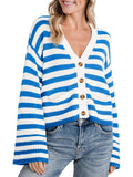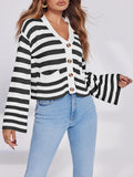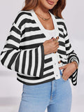 Women's Striped Cropped Button Open Front Long Sleeve Knit Cardigan Sweater