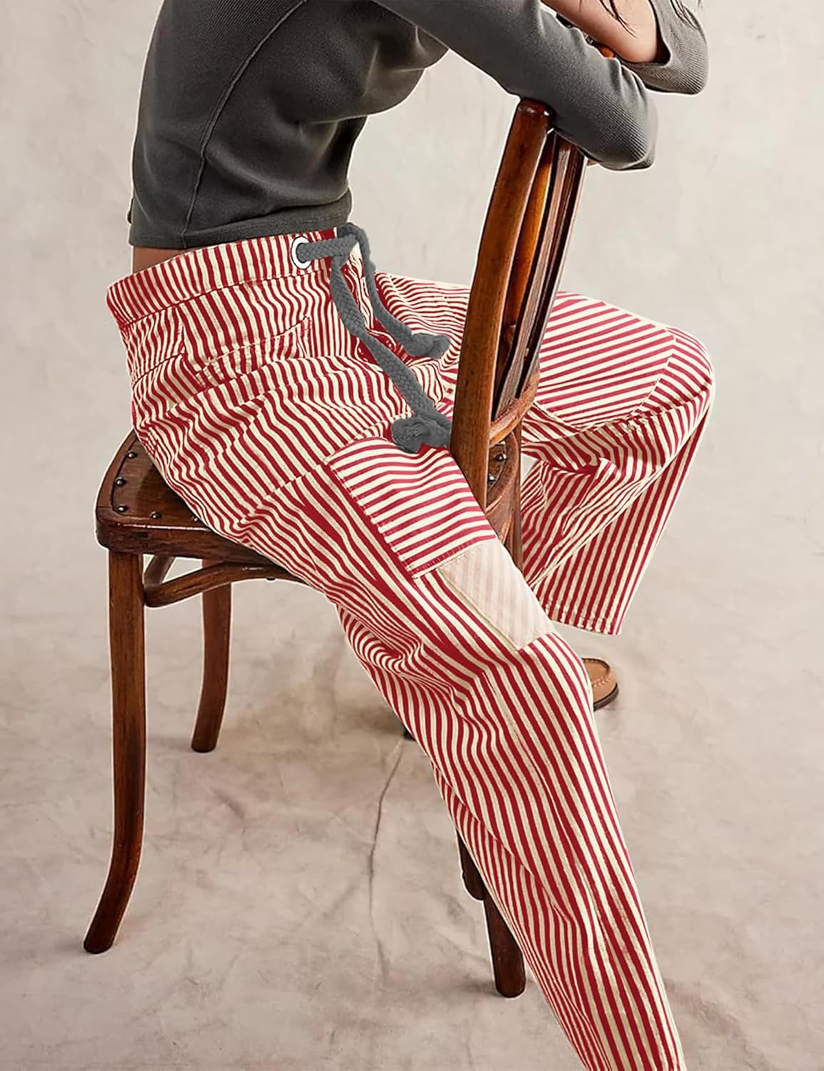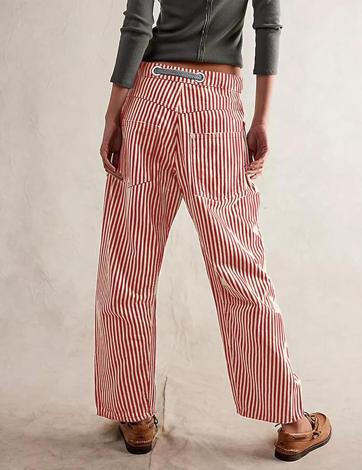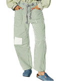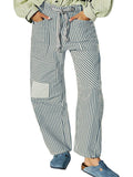 Women's Striped Drawstring Wide Leg Mom Denim Pants with Pockets