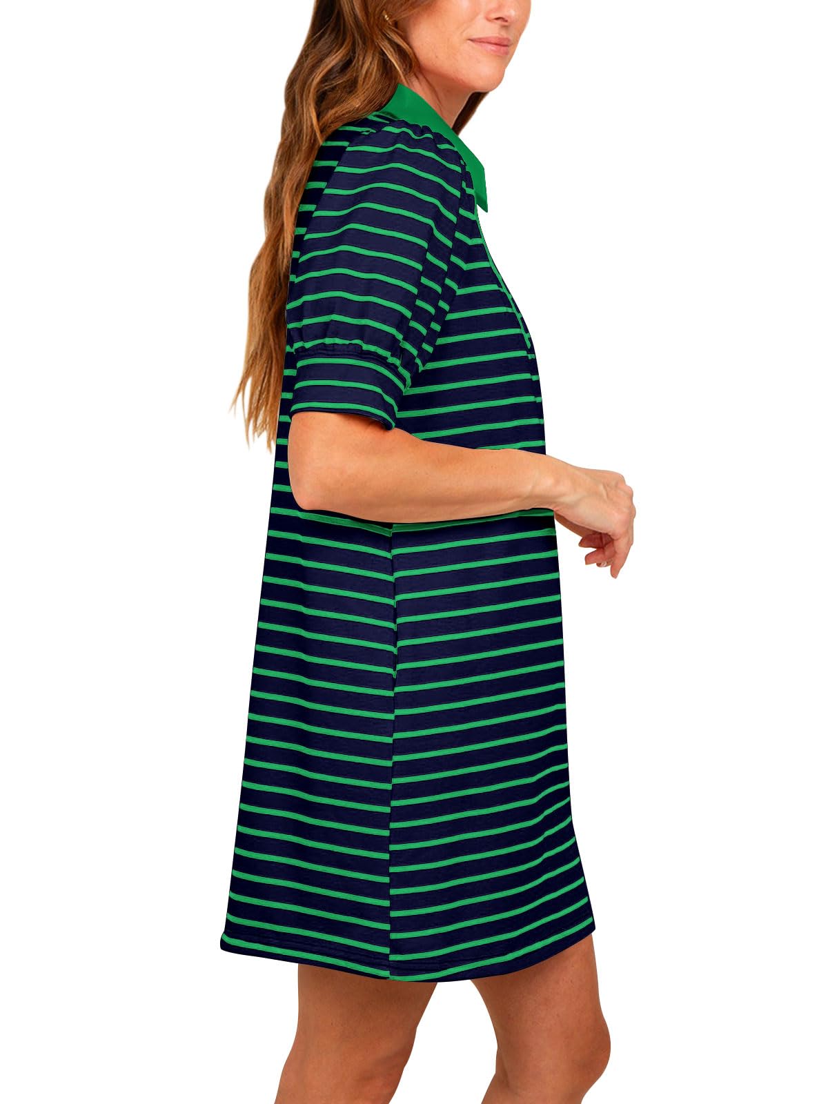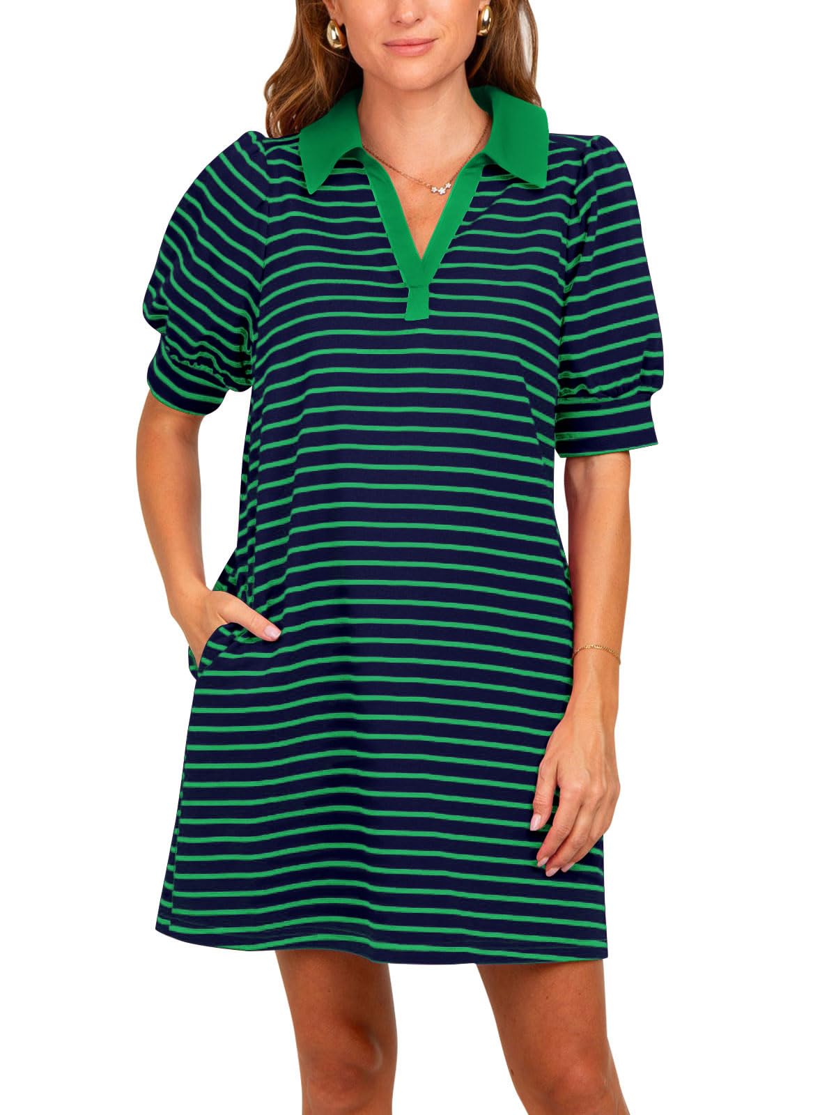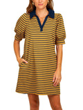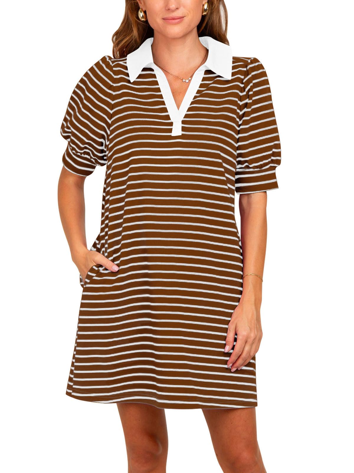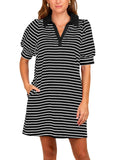 Women's Striped Puff Polo T-shirt Dresses with Pockets