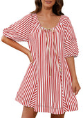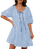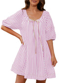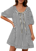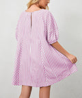 Women's Striped Puff Sleeve Scoop Neck Keyhole Back Swing Dress