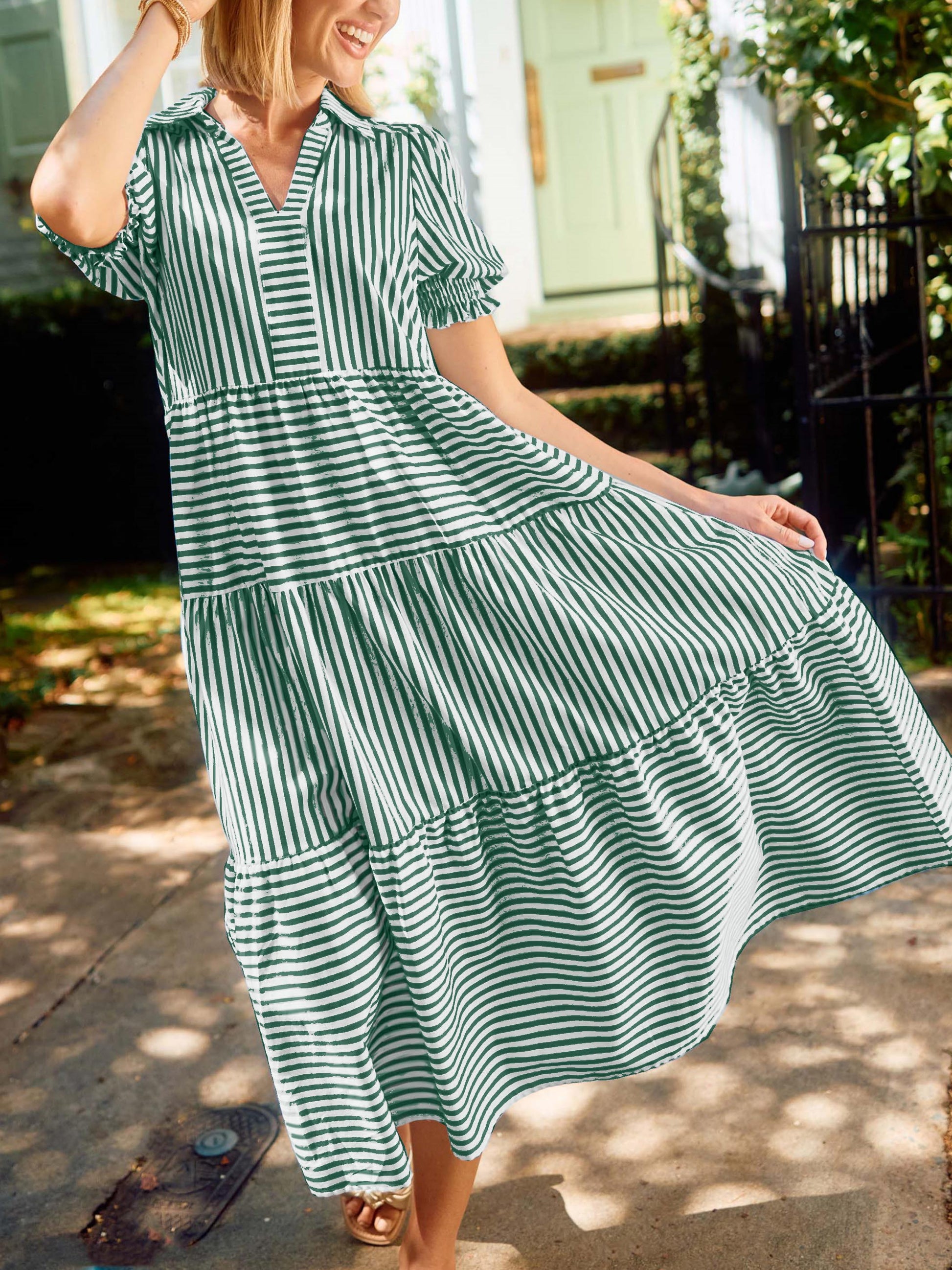 Elevate your style with this striped V-neck puff-sleeve dress. Featuring a flattering V-neckline, bold stripes, and chic puff sleeves, this dress offers a perfect blend of elegance and modern sophistication for any occasion.