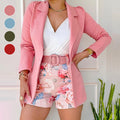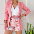 FLORAL PRINT SHORTS: Matching floral print shorts are the perfect complement to the blazer, offering a playful, feminine touch. The shorts feature a wide belt in the same color and a flattering, relaxed fit.