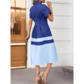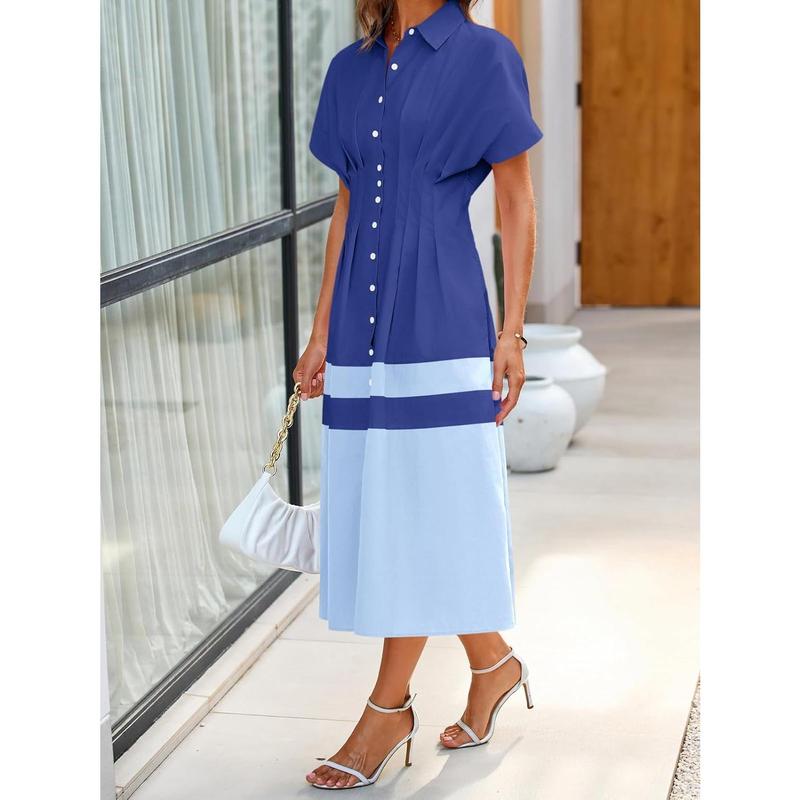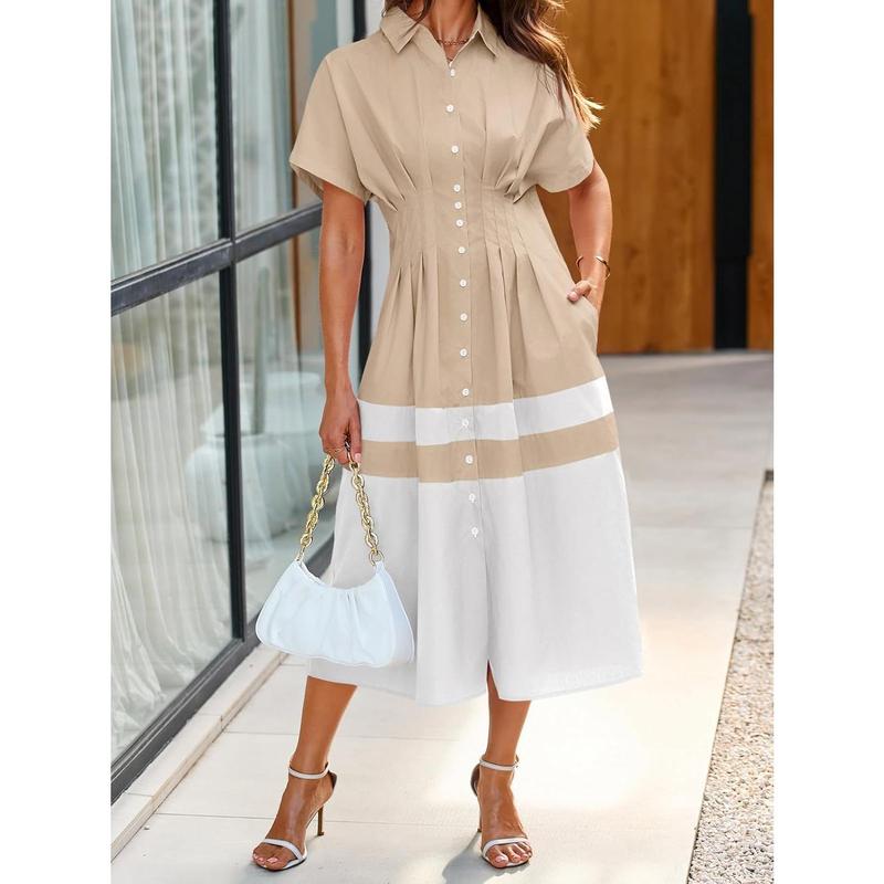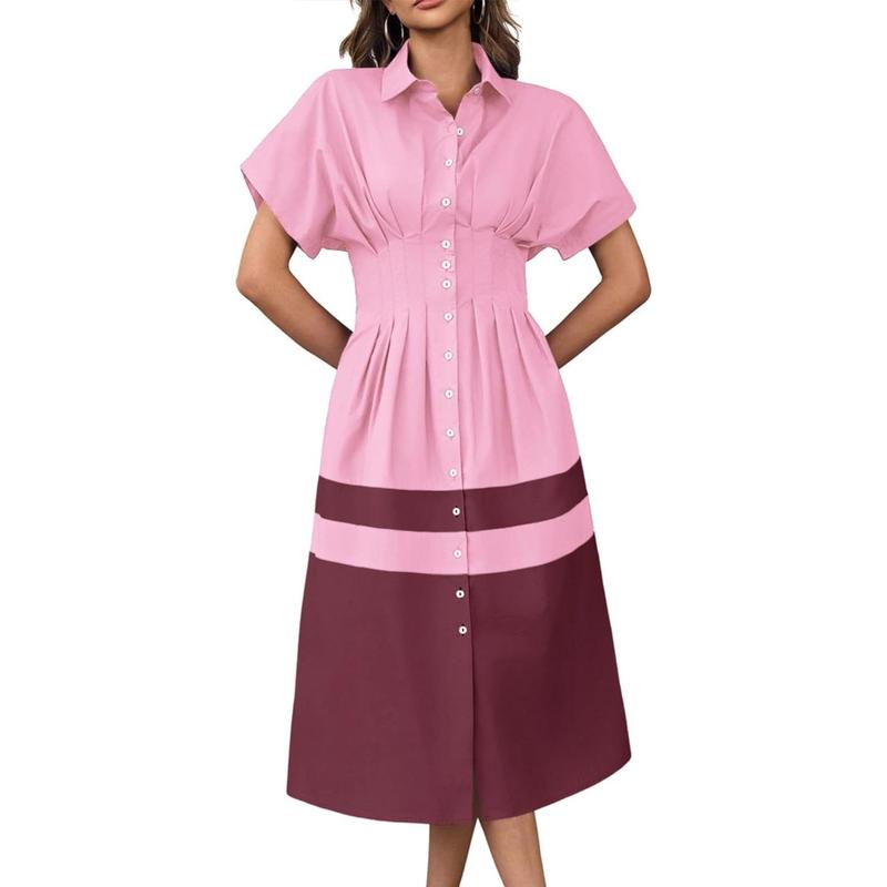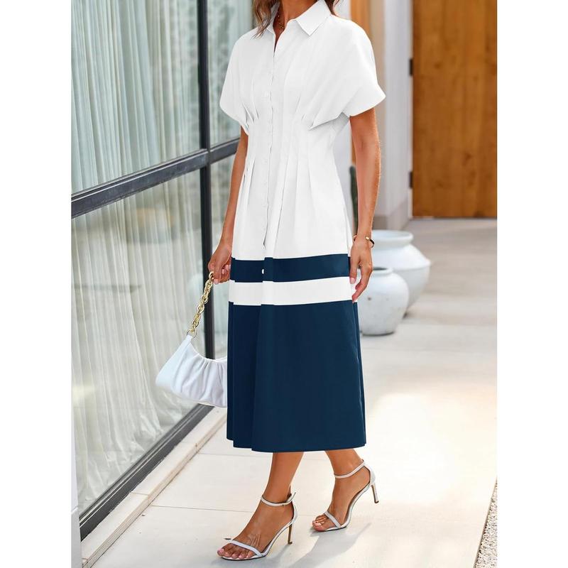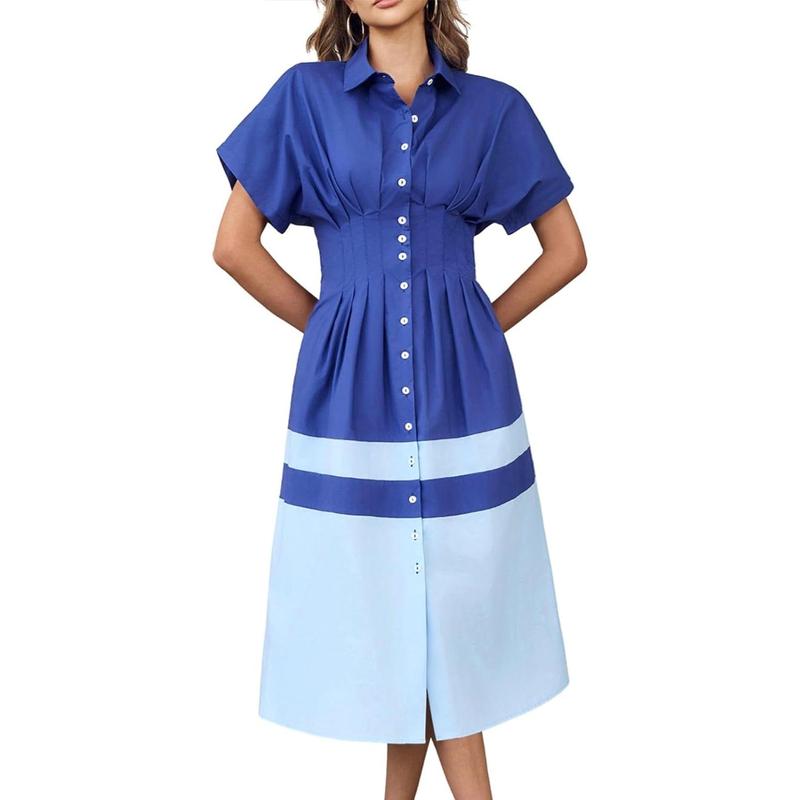 - Dress Chic Design: It features a button-down design with a collar V-neck, adding a touch of sophistication. The color block pattern enhances the visual appeal. Corset waist and pleated design accentuates the figure, while the midi length is versatile