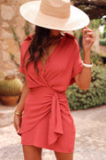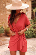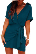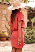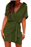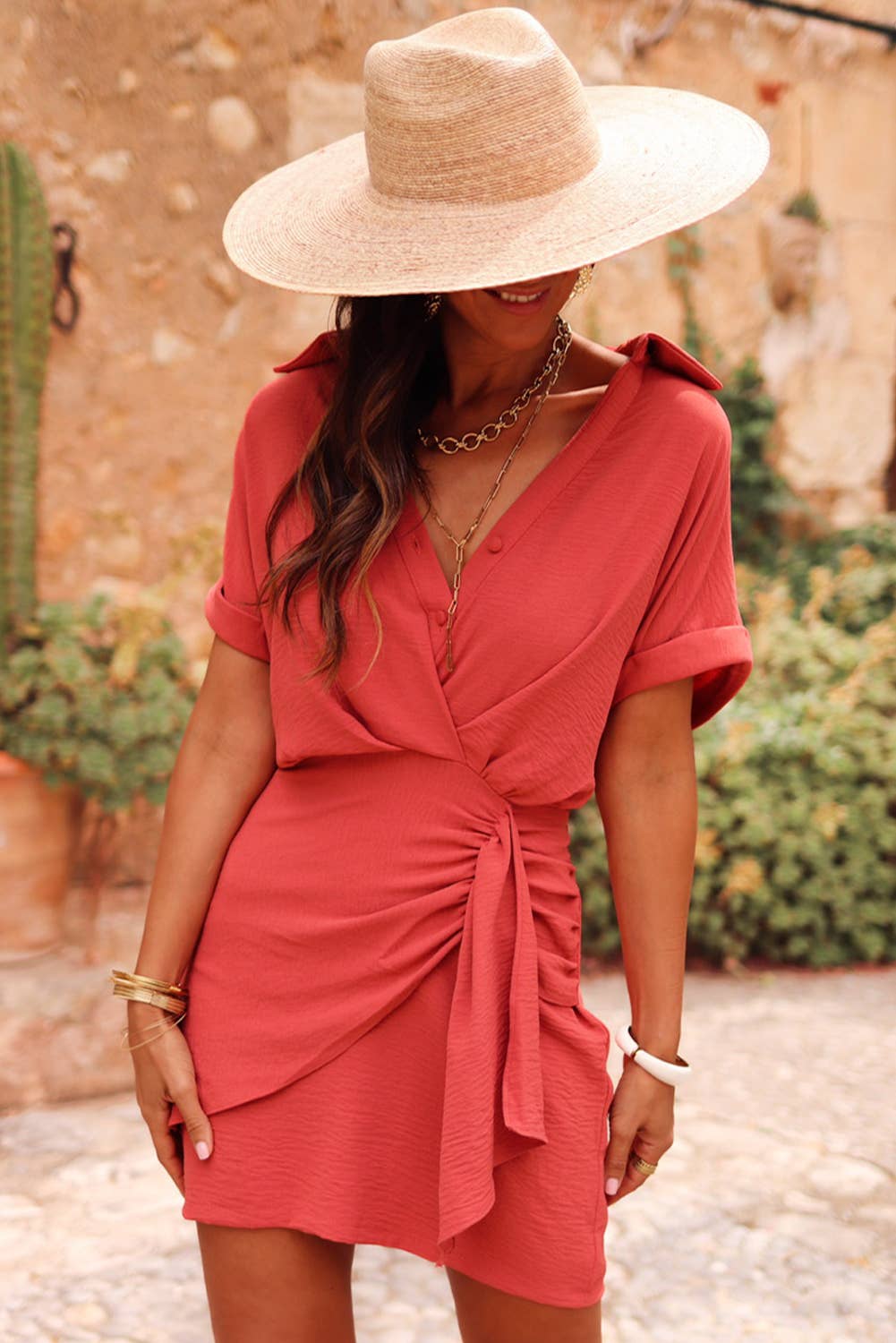 Womens Summer Dresses Pleated and Waisted Solid Color Button Front Short Sleeve Dress