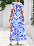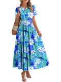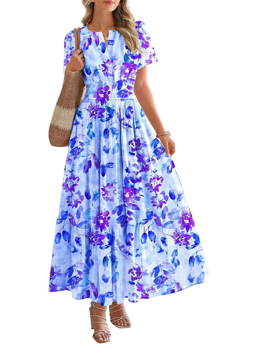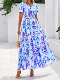 Women's Summer Floral Short Sleeve V Neck Elastic Waist Tiered Maxi Dress Pockets