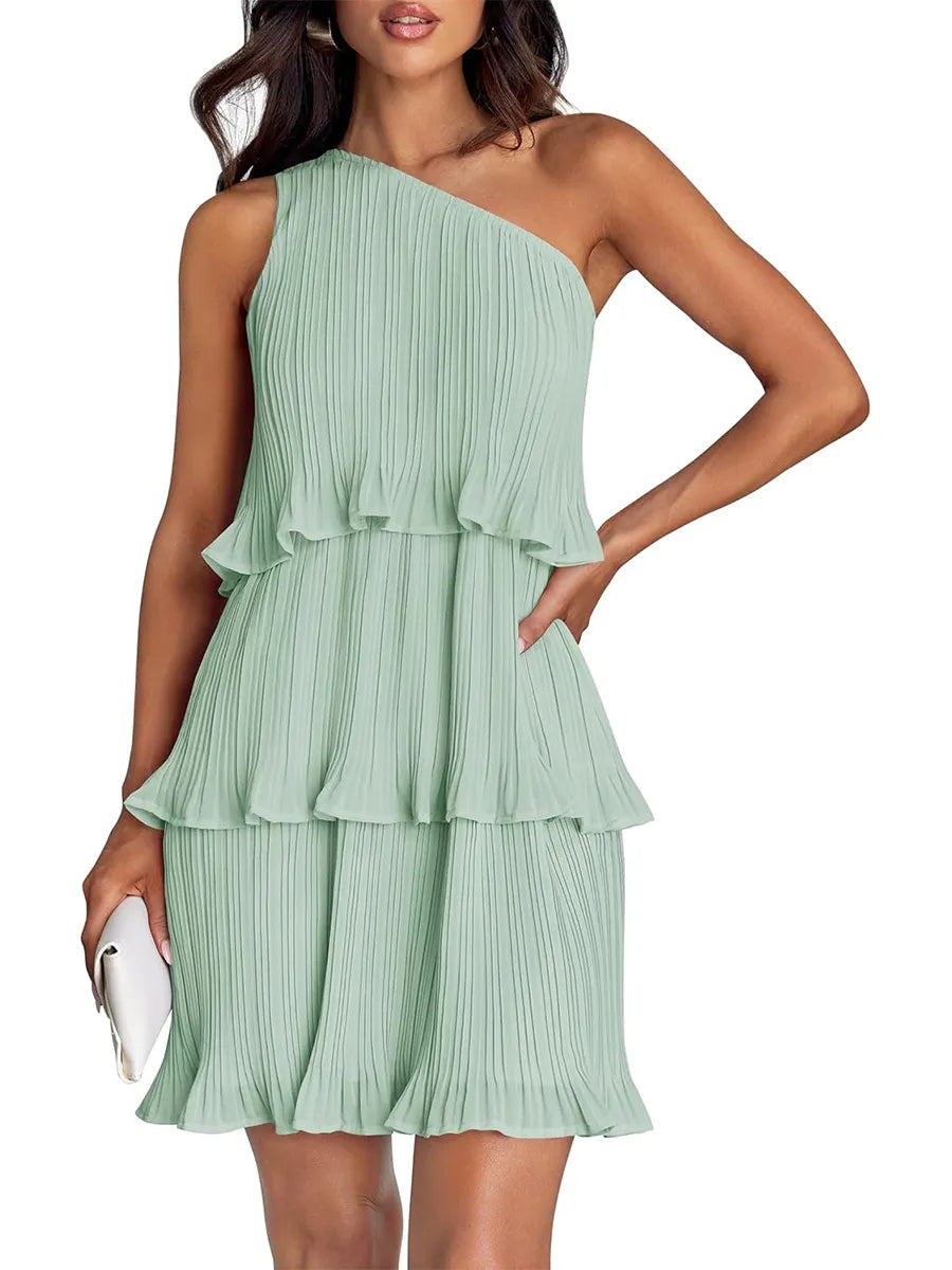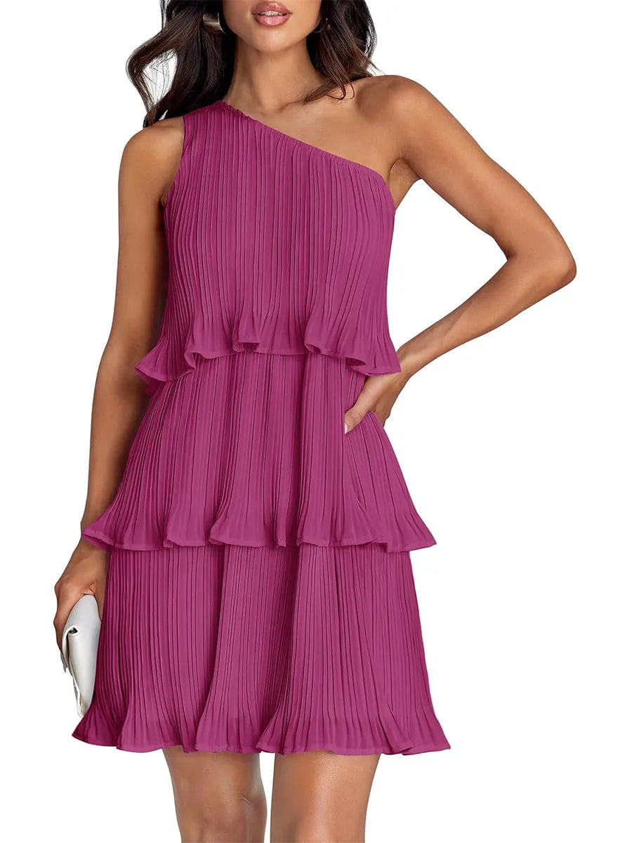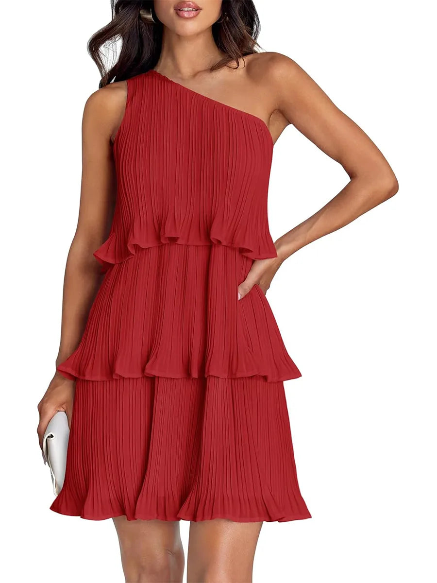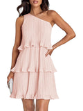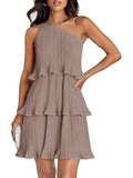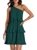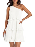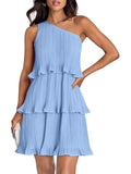 Women's Summer One Shoulder Ruffle Tiered Layered Chiffon Flowy A Line Dress