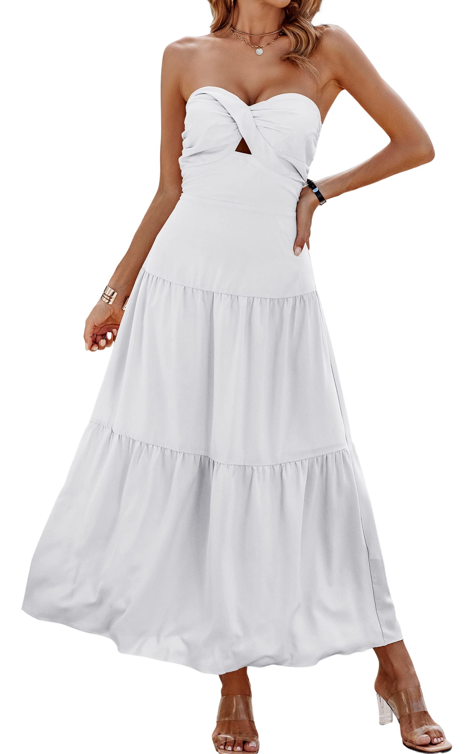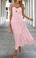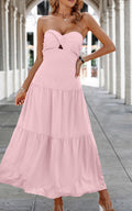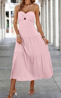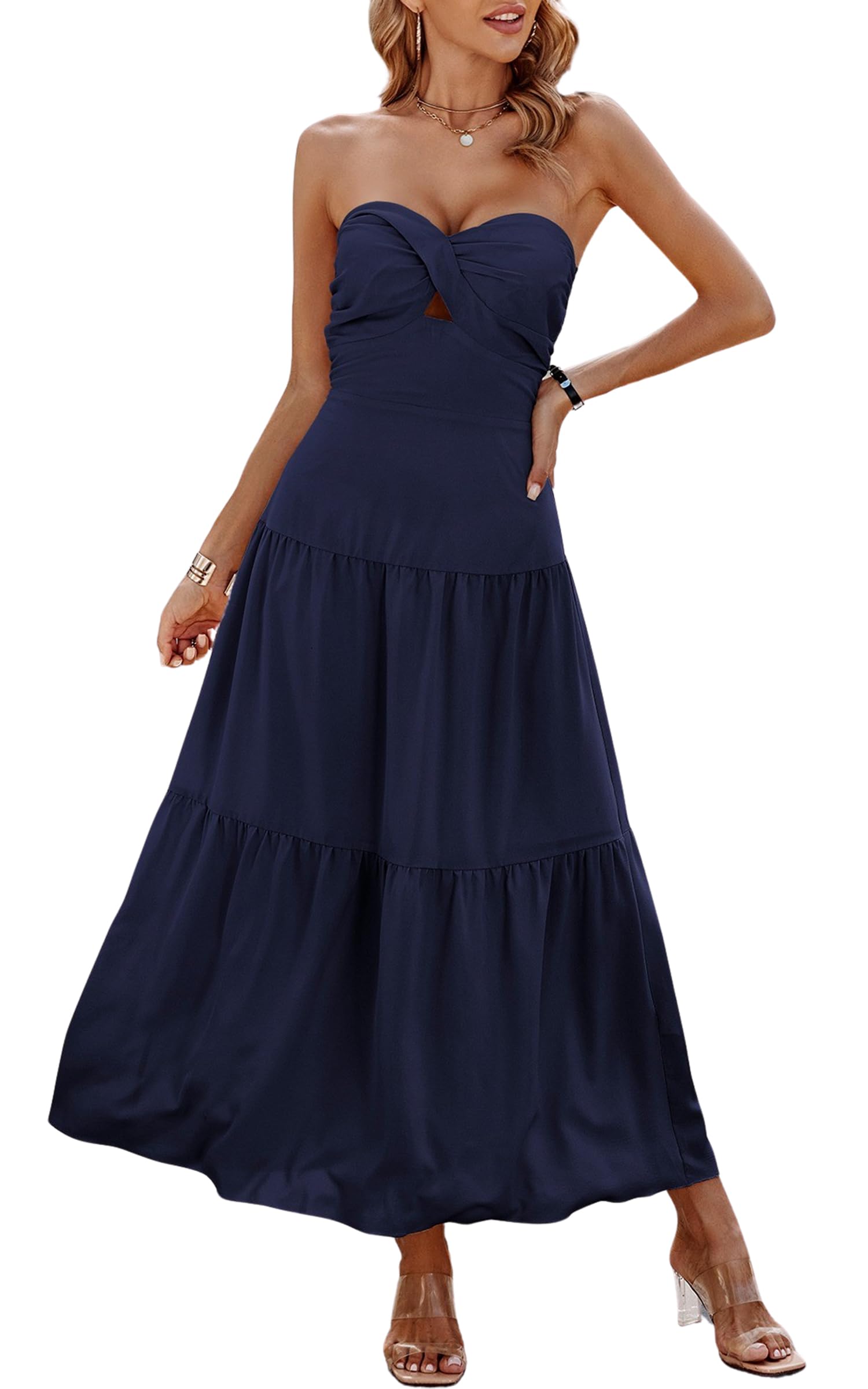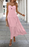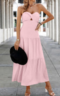 Step into the sunshine with this Strapless A-Line Maxi Dress, where flirty meets feminine. Featuring a twisted front cutout, flowy tiered skirt, and comfy smocked back, this dress is made for sun-chasing days and dreamy nights.
