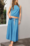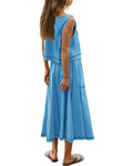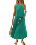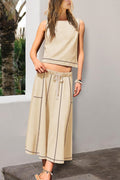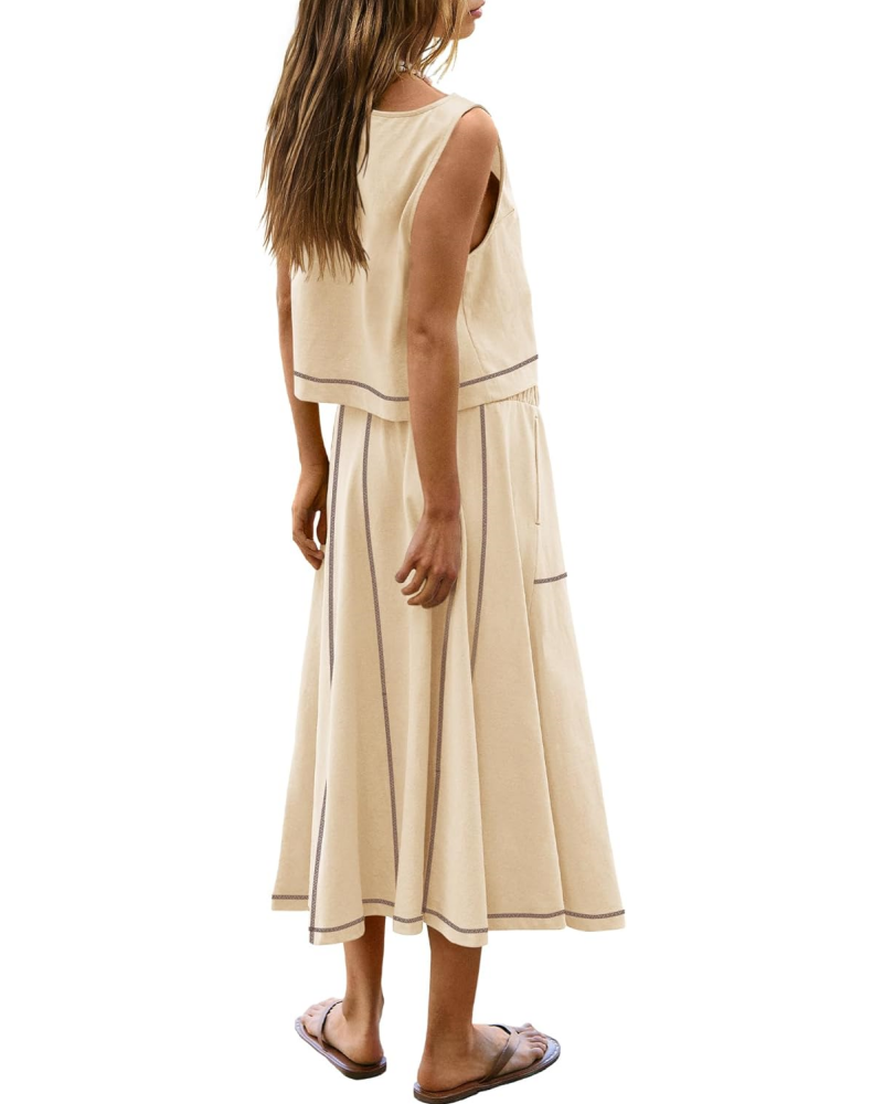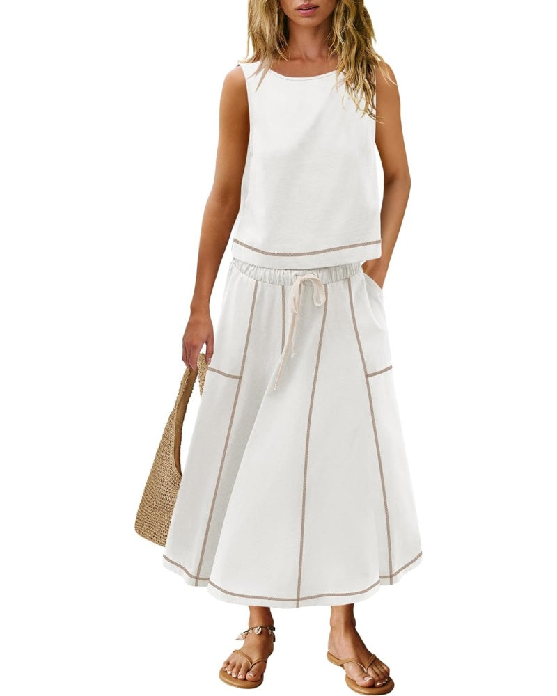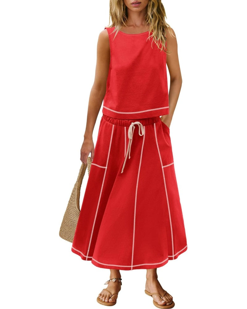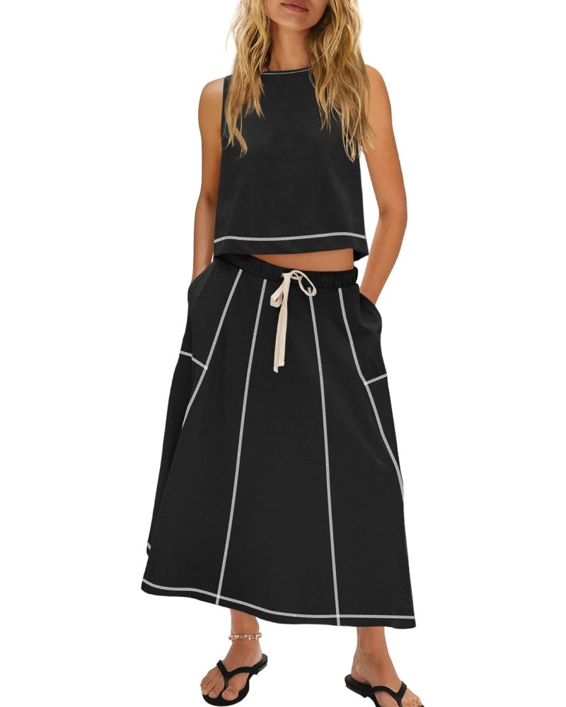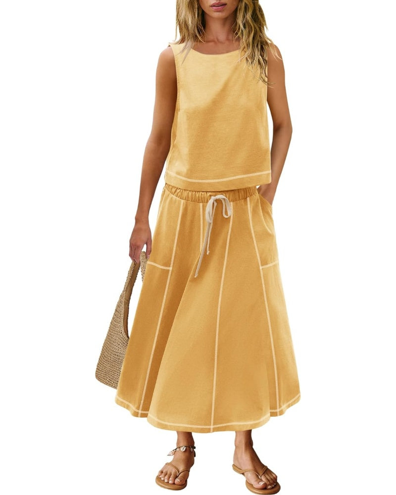 Elevate your summer style with this sleeveless tank top and skirt two-piece set, featuring convenient pockets. Perfect for vacations, this chic ensemble combines comfort and fashion.