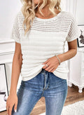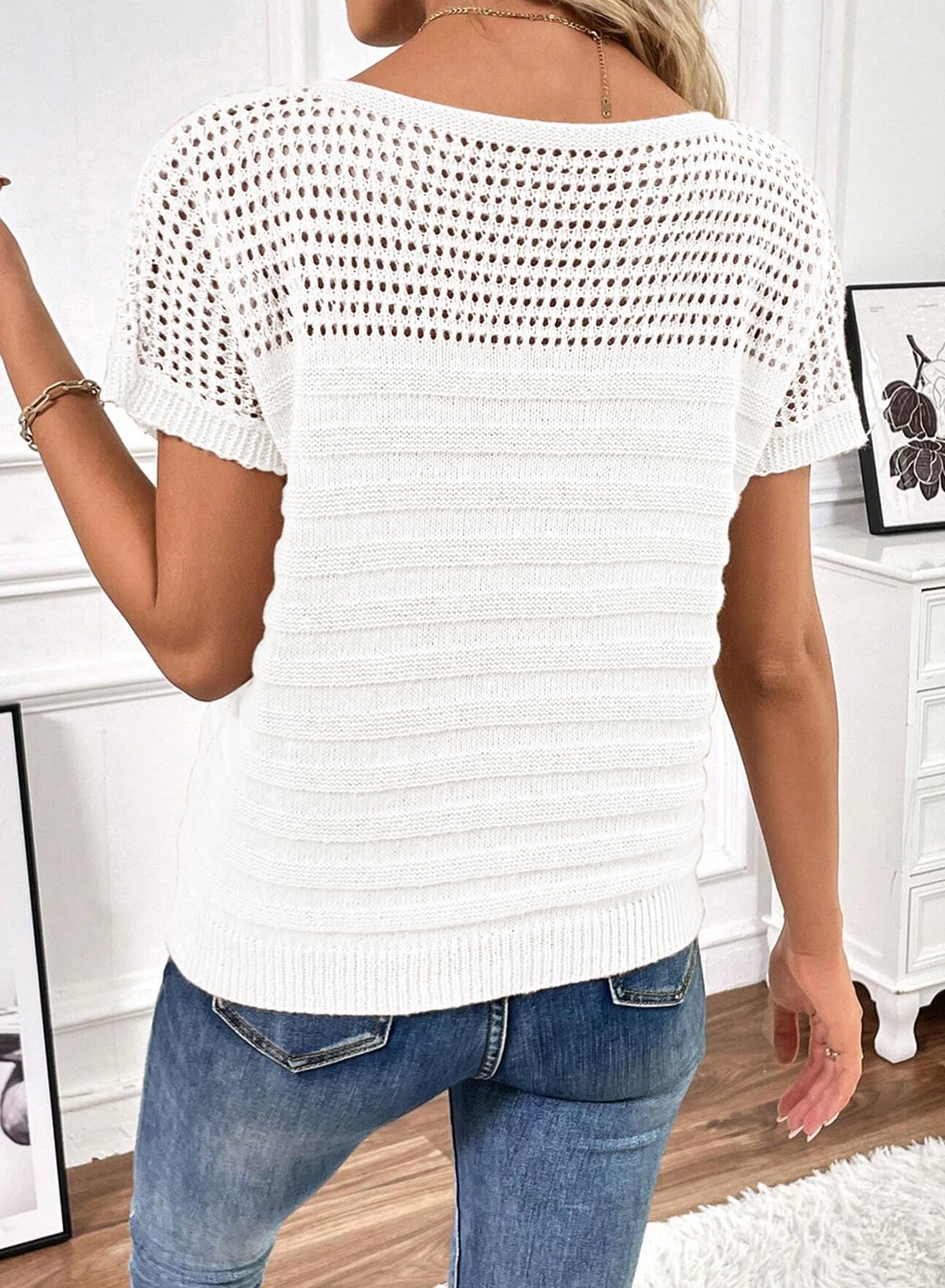 Discover next-level comfort with this airy knit top featuring an open-weave yoke and ribbed body. The lightweight stretch fabric and relaxed silhouette make it your go-to piece for effortless ease and breathability.