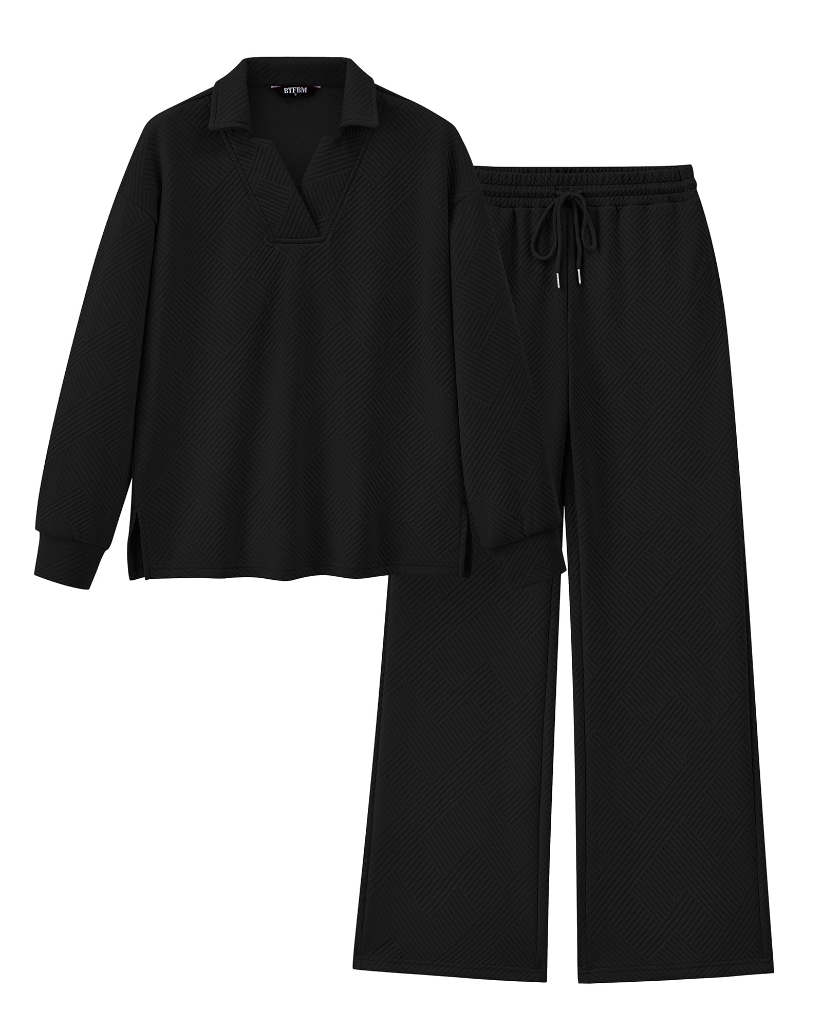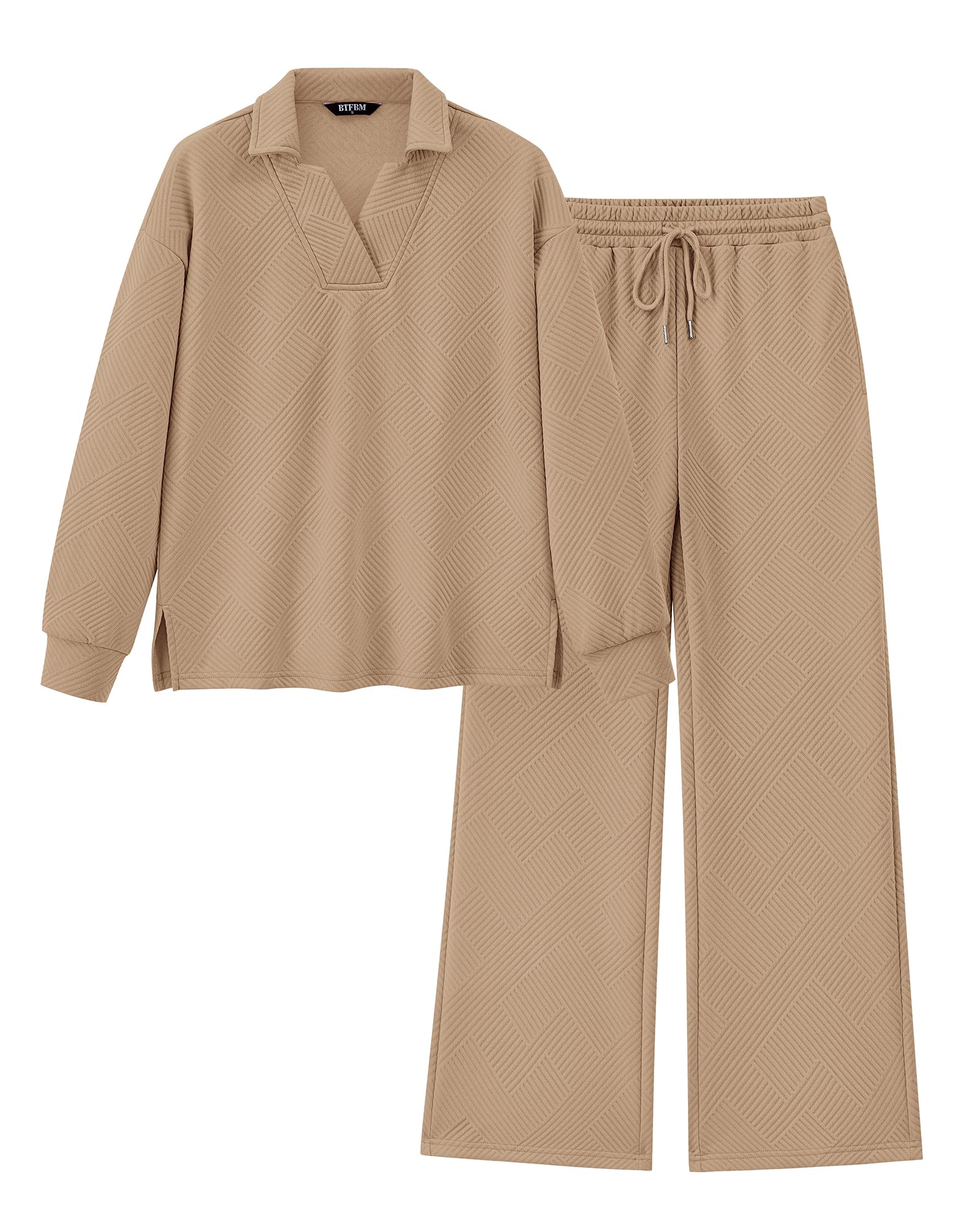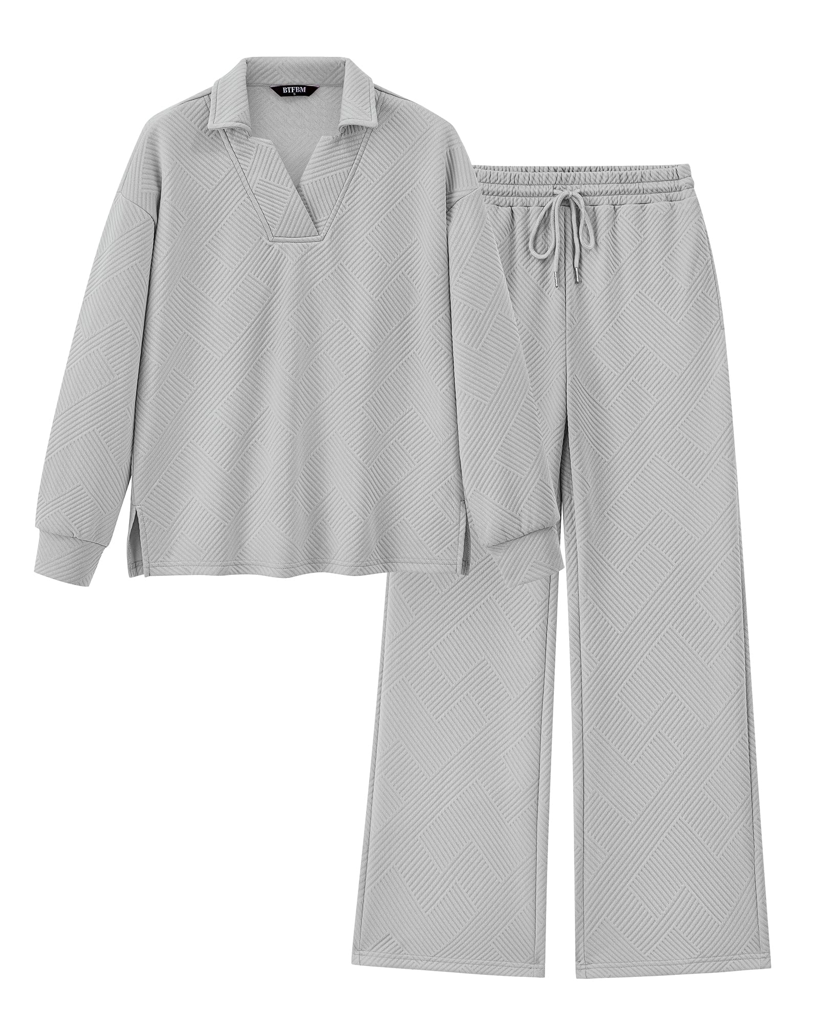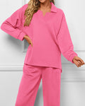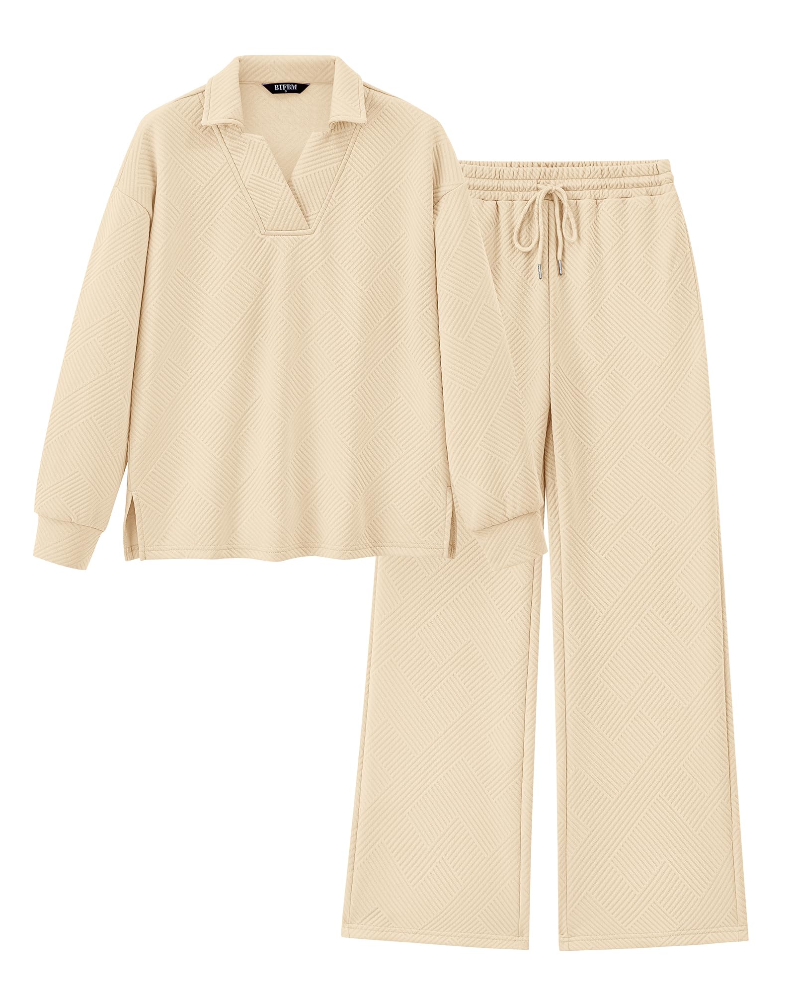 Women's Textured Lapel V Neck Pullover and Wide Leg Pants Lounge Set