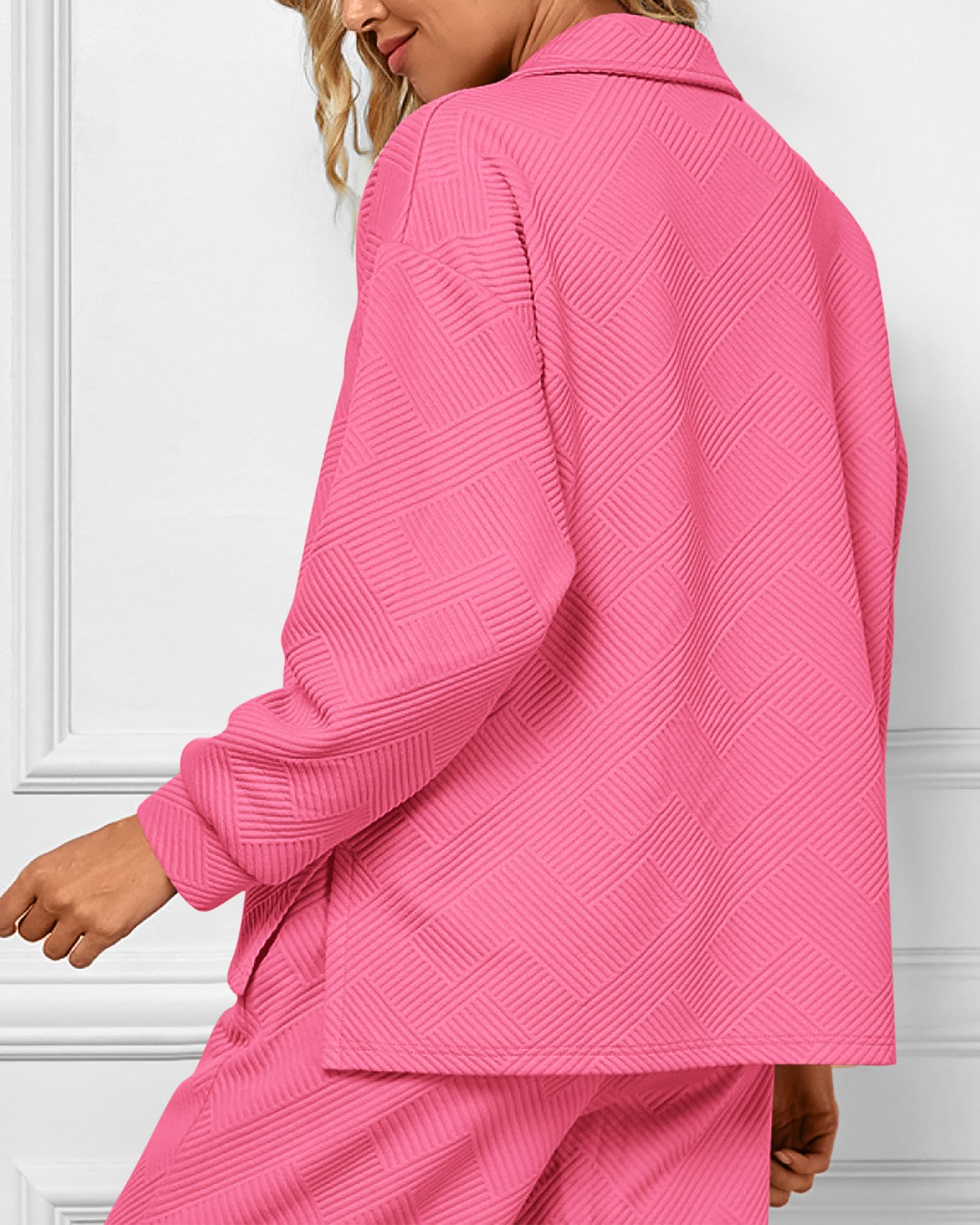 Relax in style with this effortlessly chic lounge set. Featuring a relaxed-fit top with a subtle collar and wide-leg pants, this set brings you comfort without sacrificing style. The textured fabric adds a touch of sophistication, making it perfect for lounging at home or casual outings.