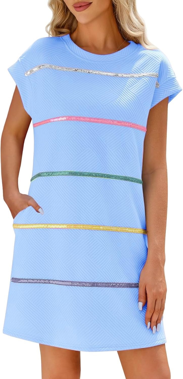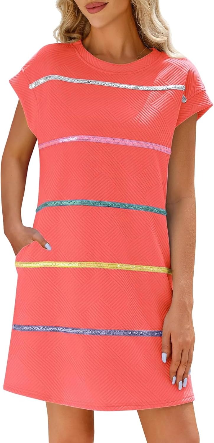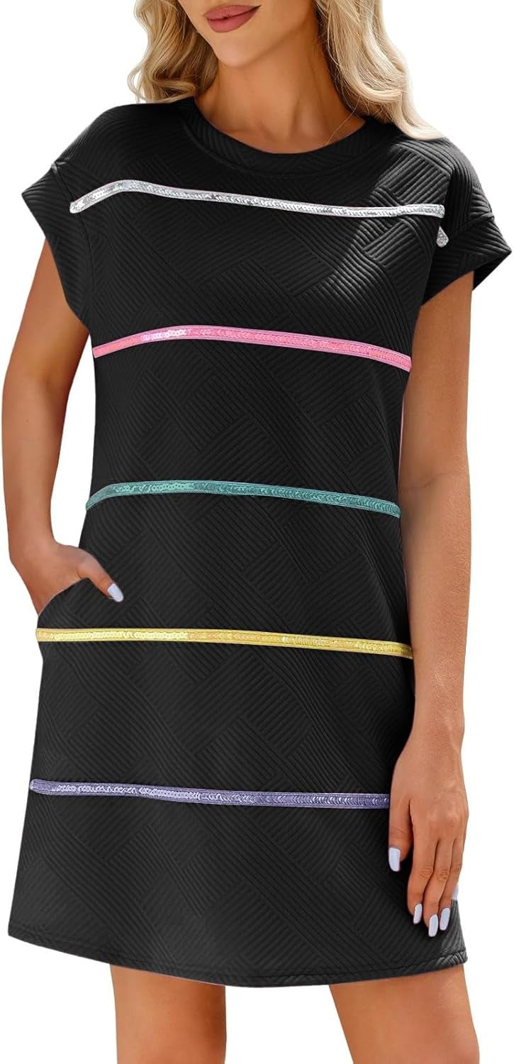 Women's Textured Sequin Cap Sleeve T-Shirt Dress with Pockets