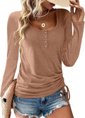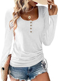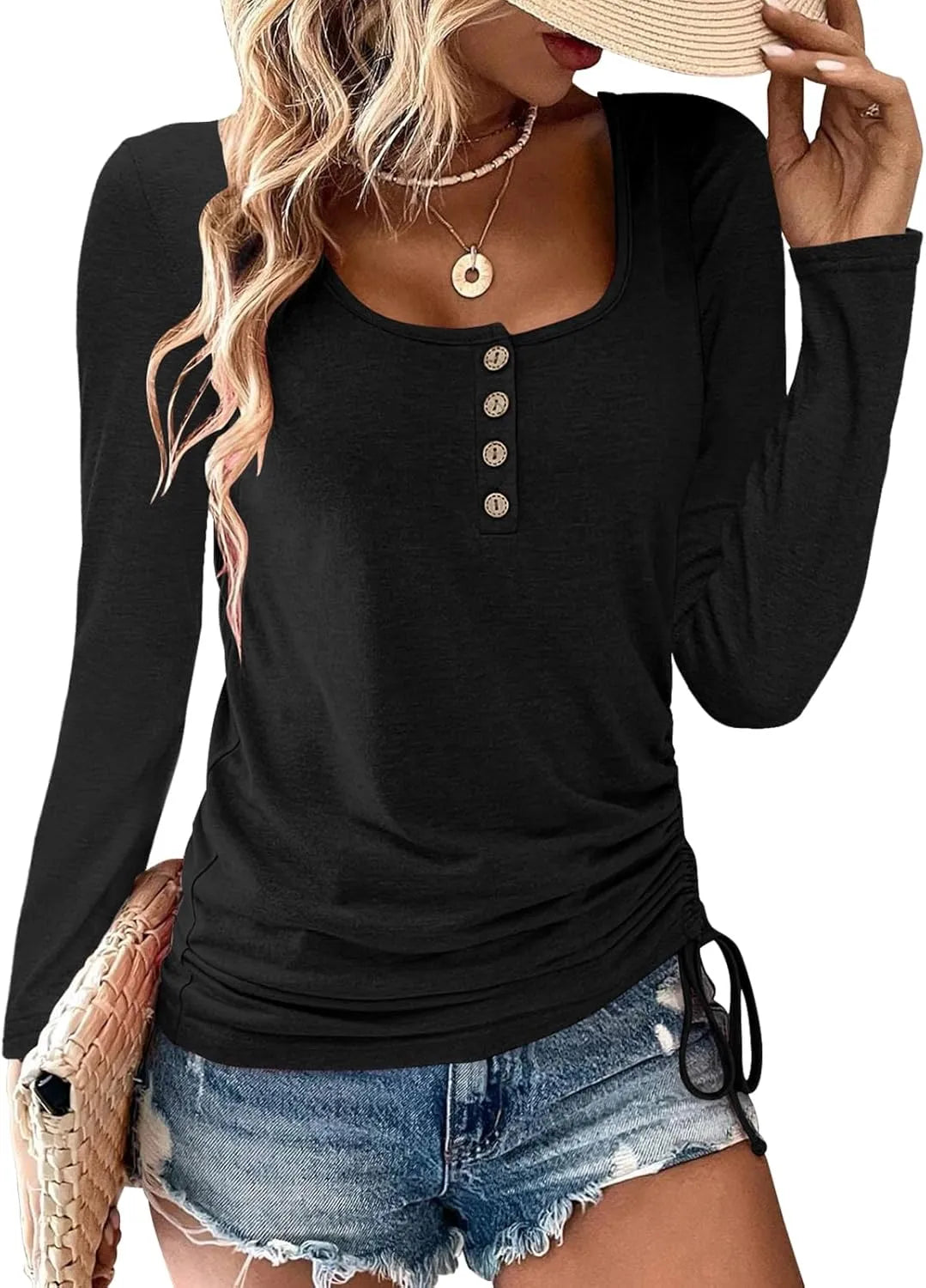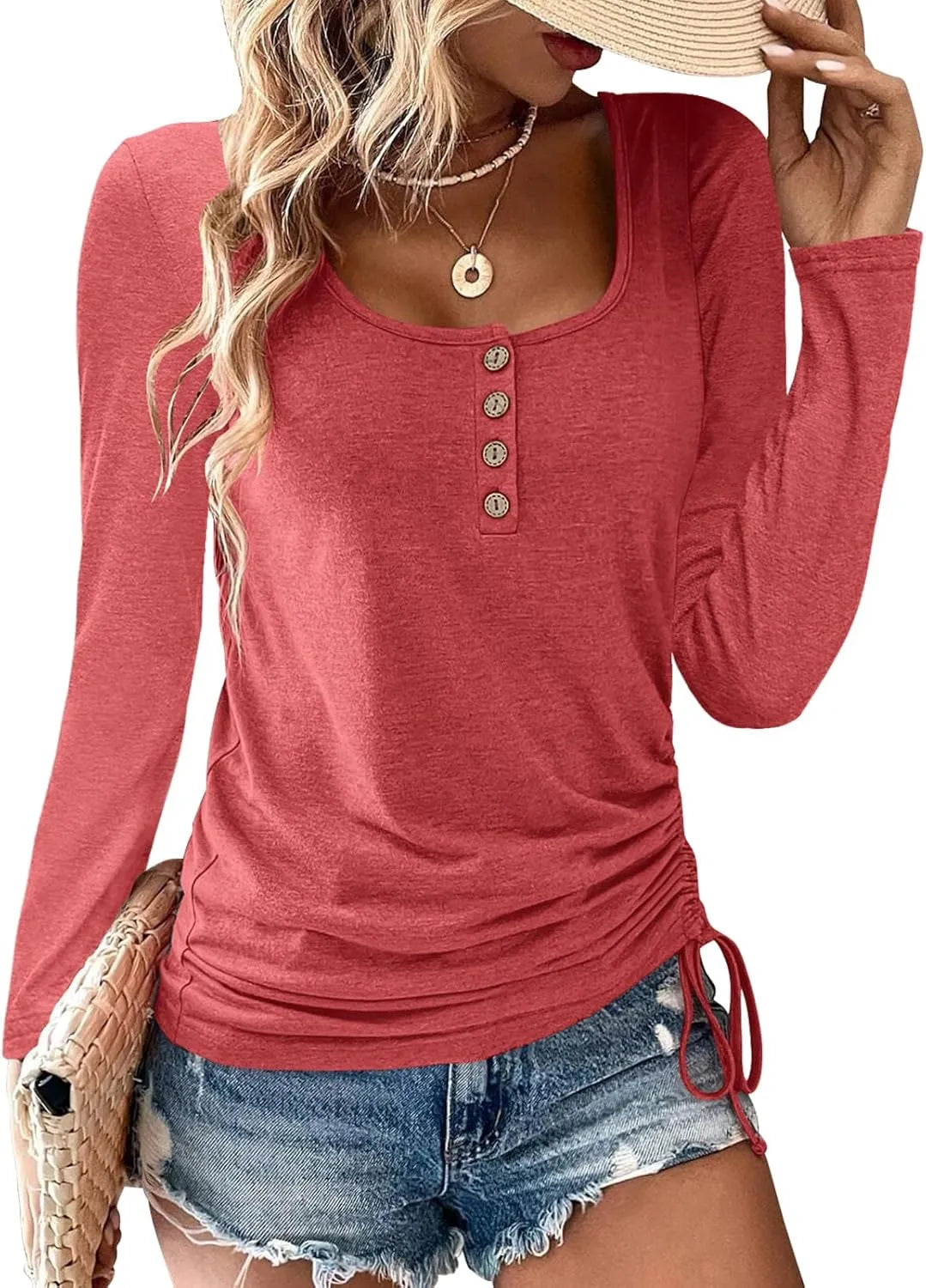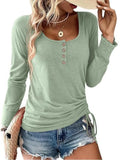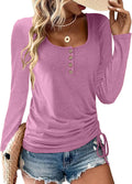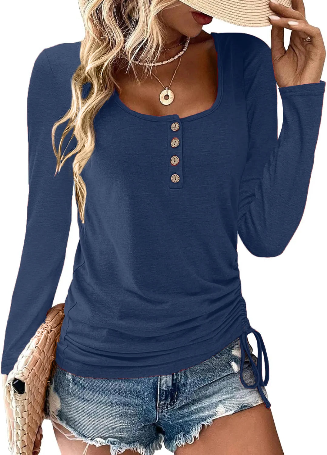 Women's U-Neck Side Drawstring Long Sleeve T-Shirt