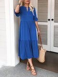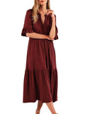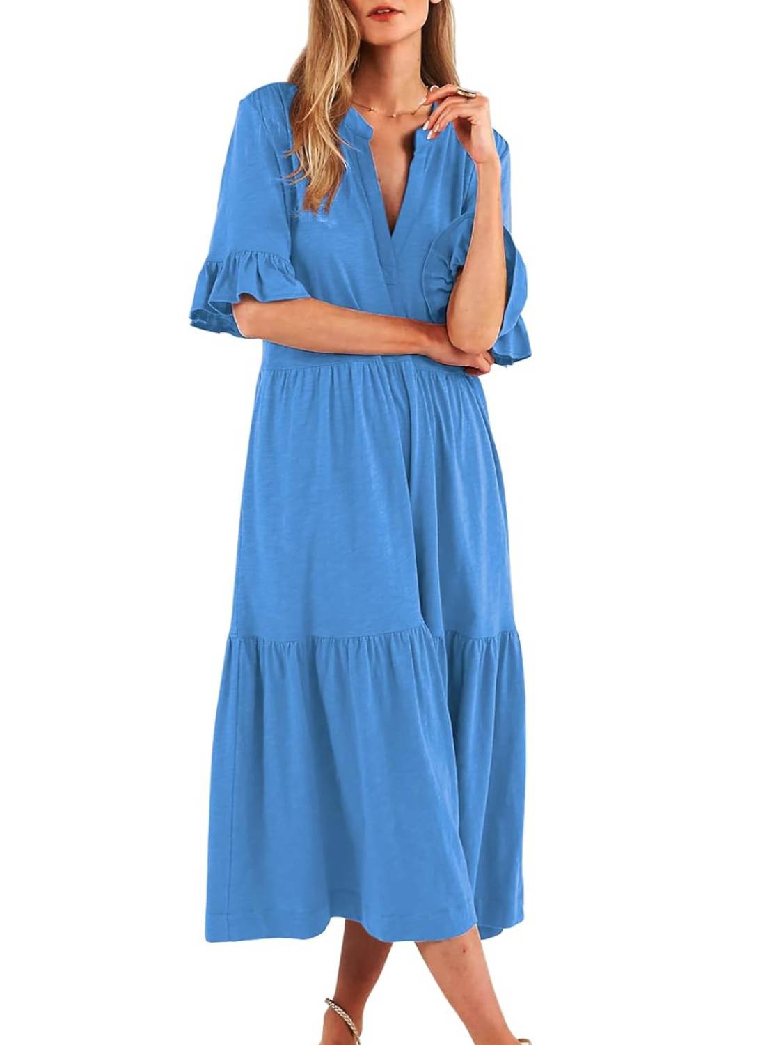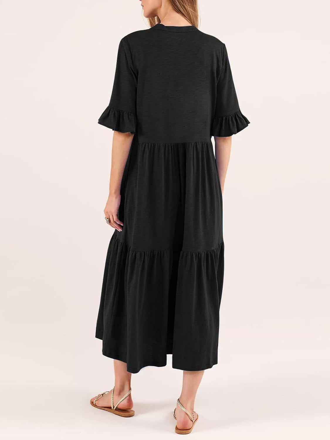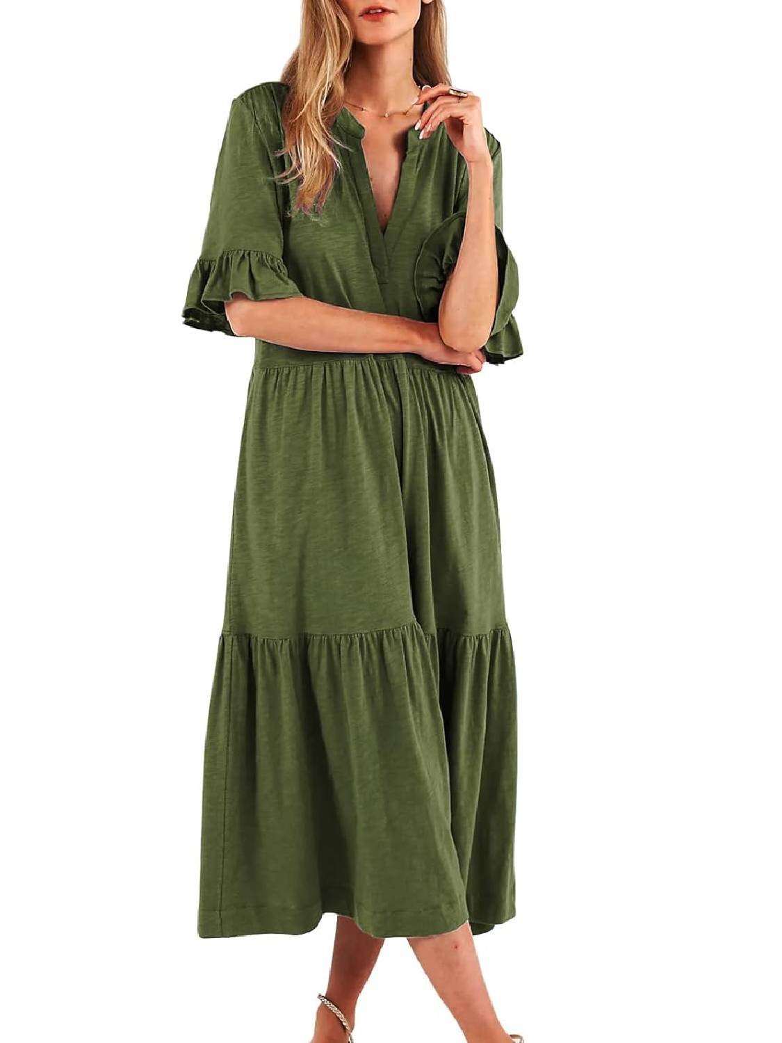 Redefine your wardrobe with the versatility of our dress, seamlessly blending the comfort of a t-shirt dress with the elegance of a maxi dress. Embrace the latest trends with its V-neck, tiered design, and short sleeves, ensuring you stay effortlessly fashionable forever.