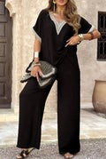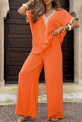 This Women's V-neck Hollow Edge Stitching Casual Set includes a short-sleeve top and wide-leg pants, combining comfort and style. The V-neck and hollow edge stitching add a unique, modern touch, perfect for casual wear.