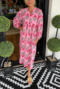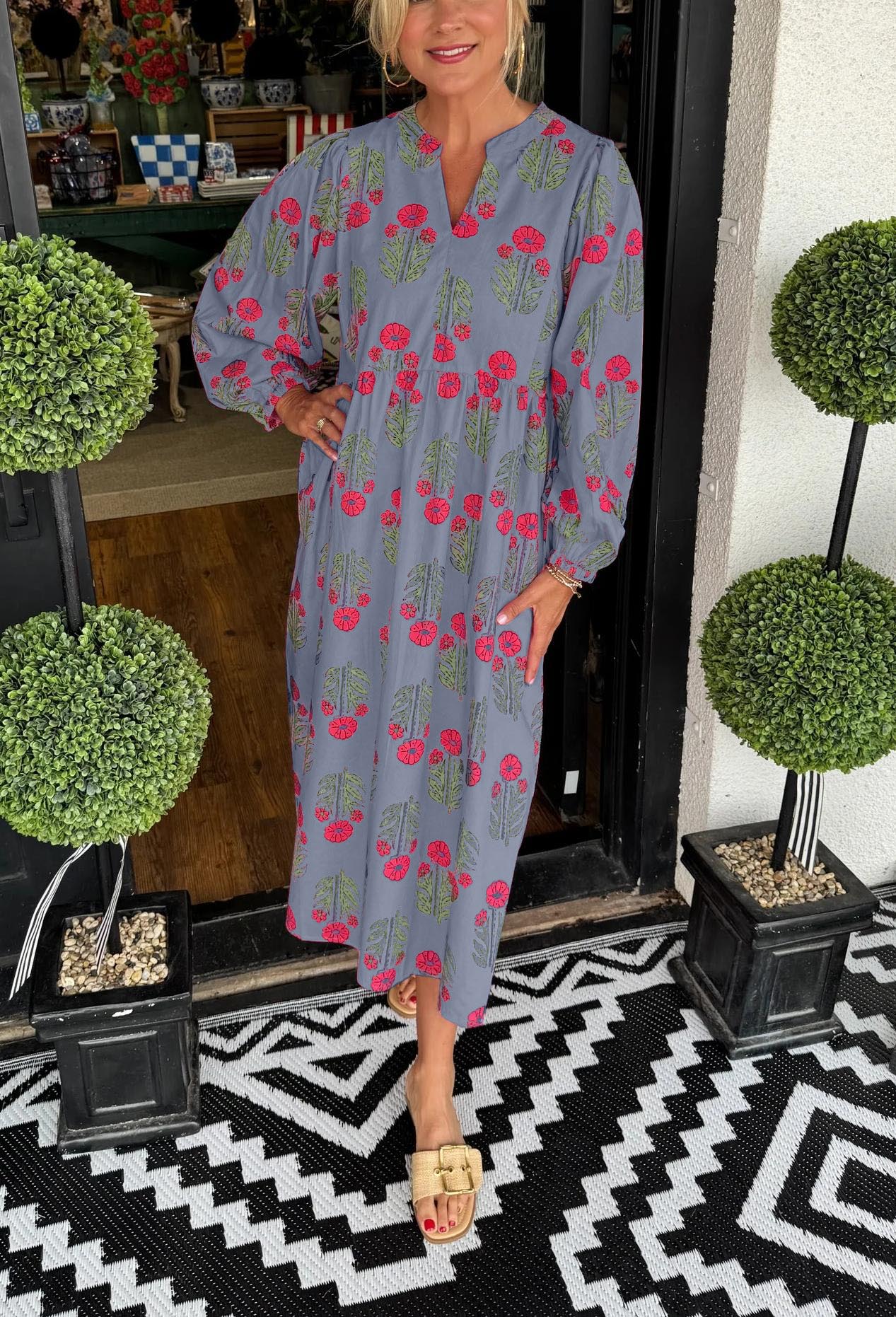 Midi dress in a beautifully patterned, lightweight fabric that drapes gracefully into a sophisticated silhouette. The breathable material is perfect for warm weather and layering for comfort without sacrificing style. Easily blending sophistication with ease, this dress is perfect for both casual and formal occasions.