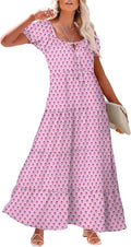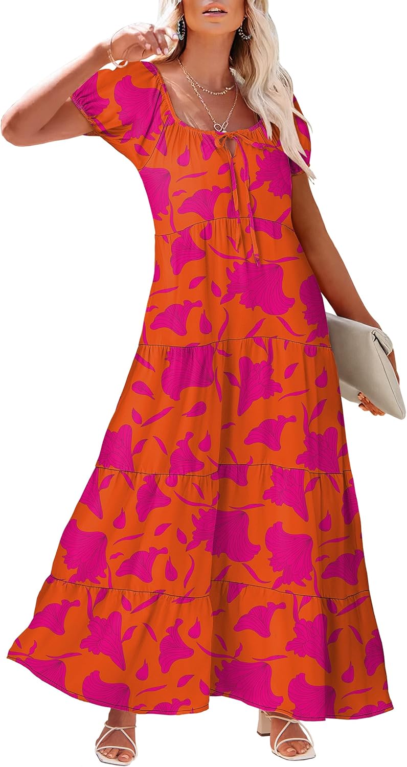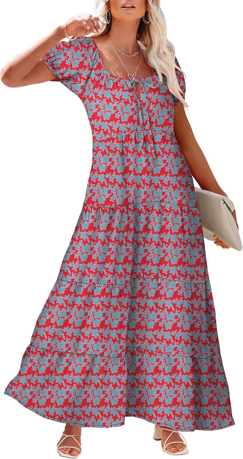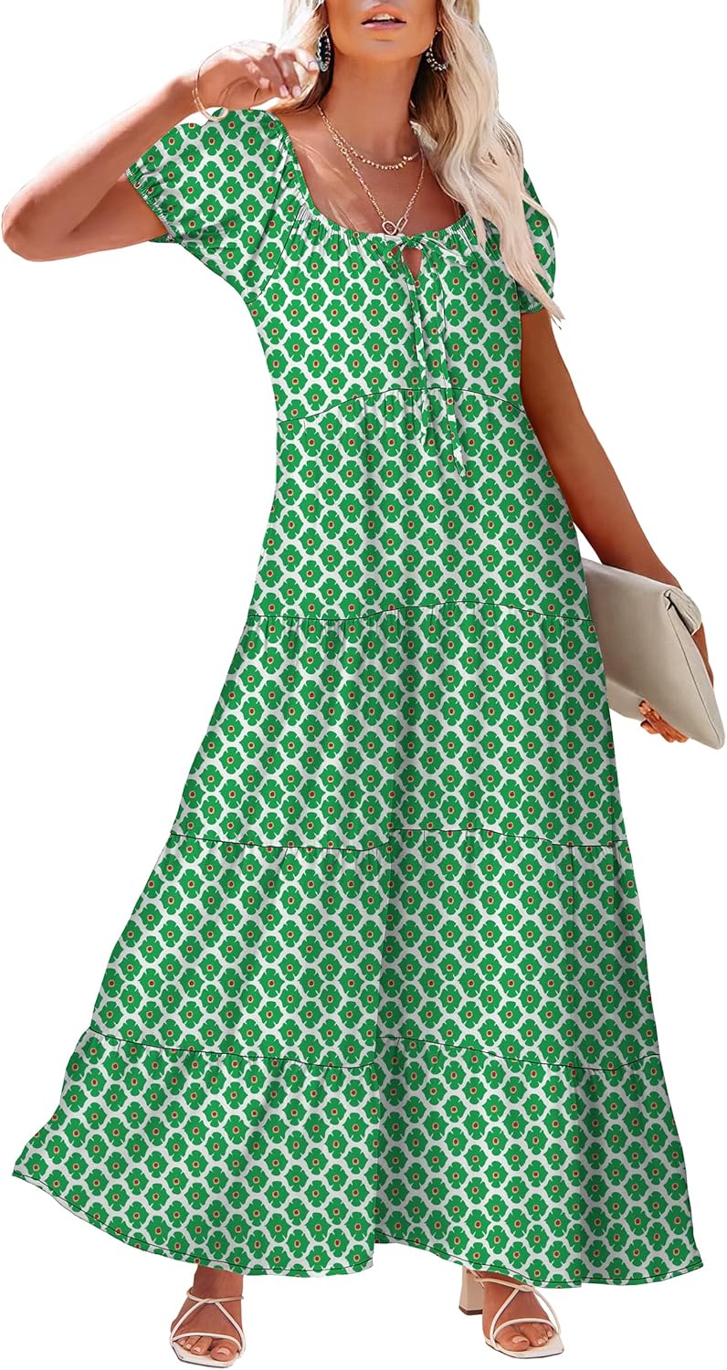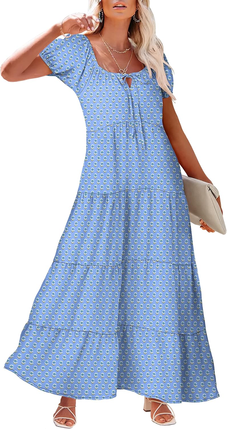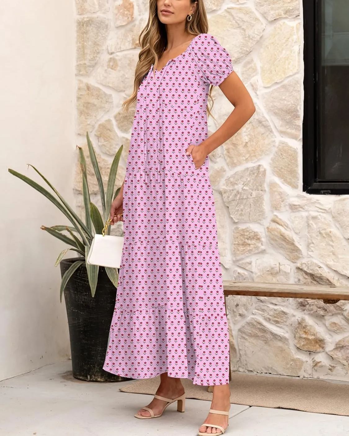 Women's V Neck Puff Sleeve Boho Maxi Dresses
