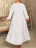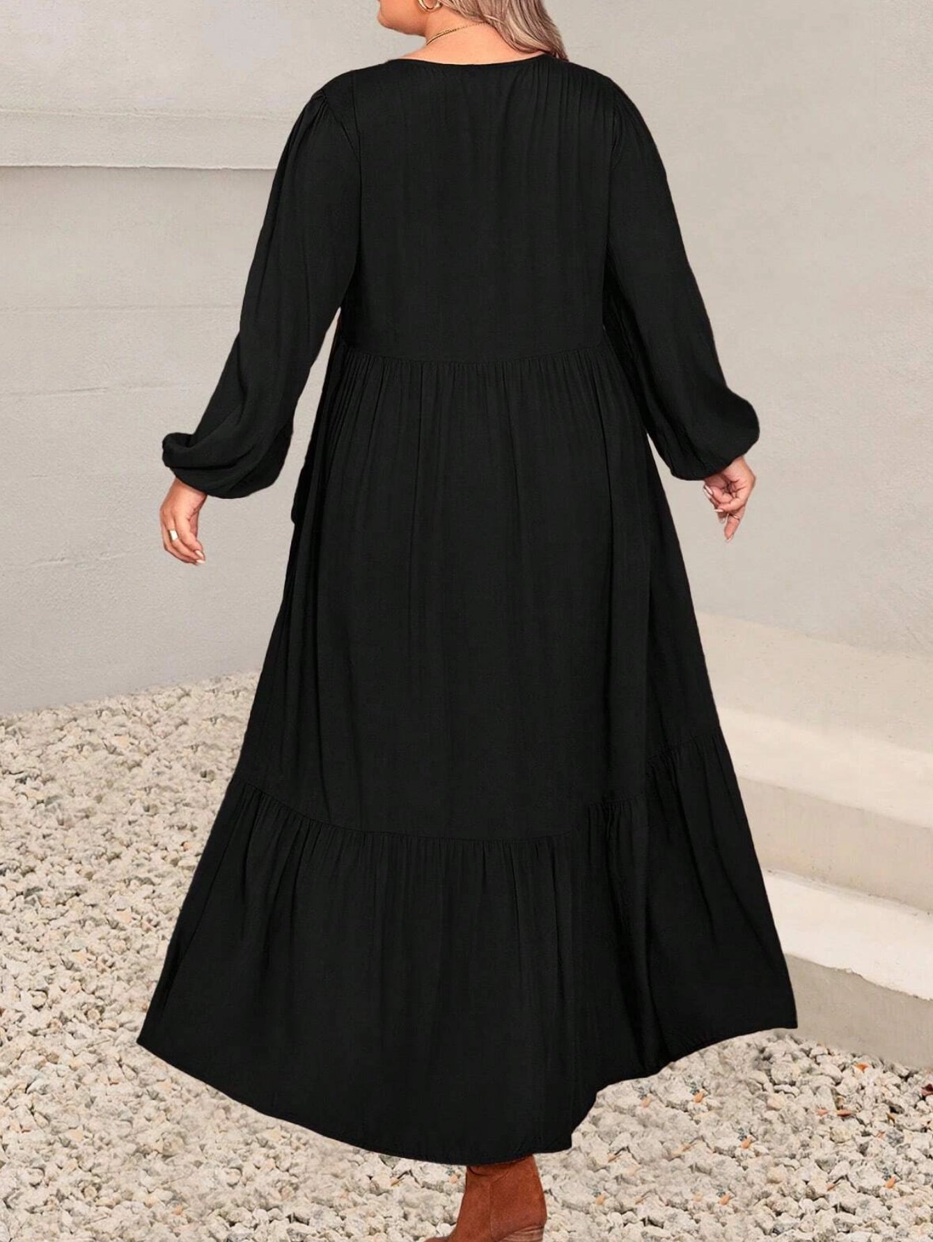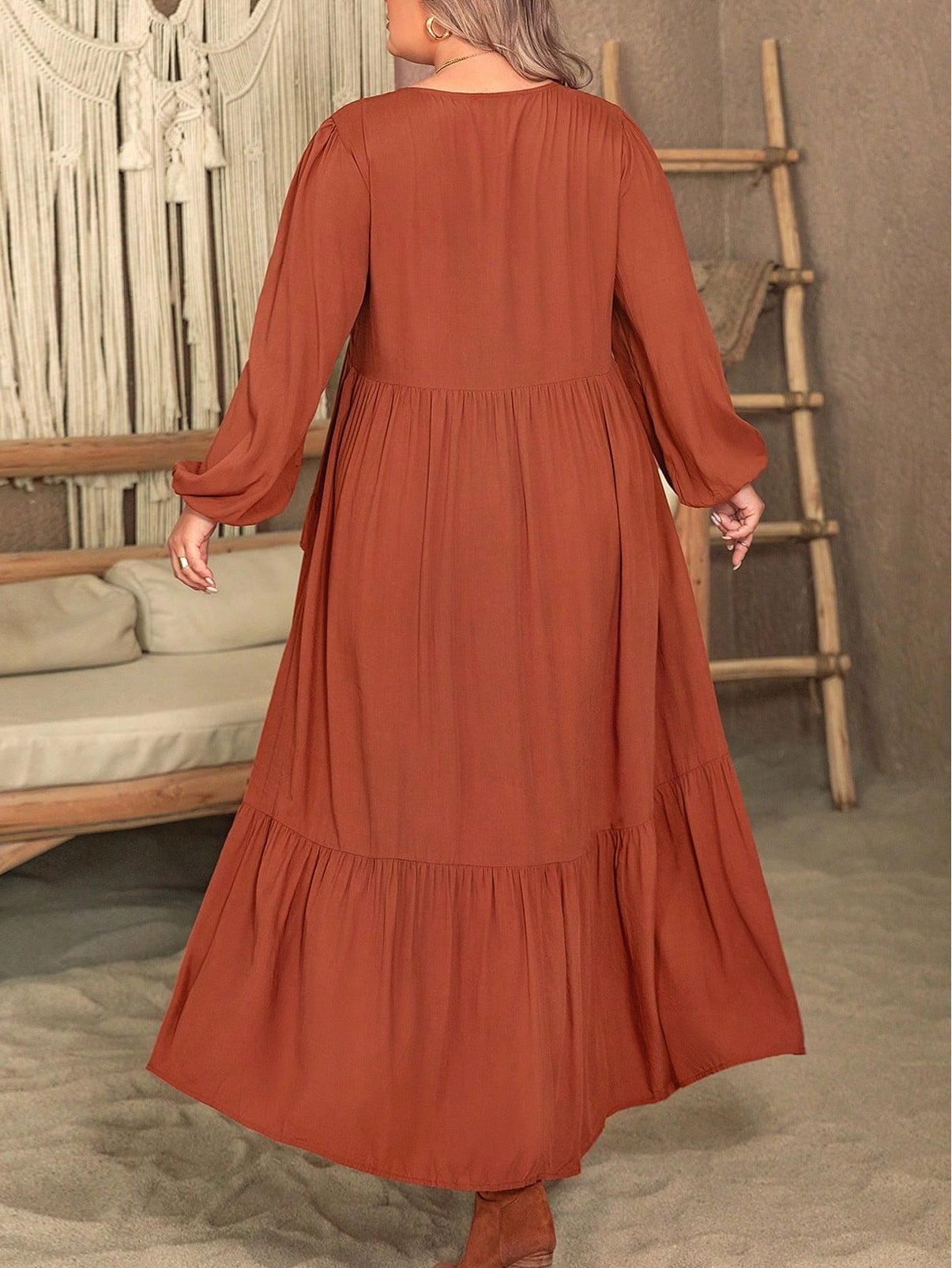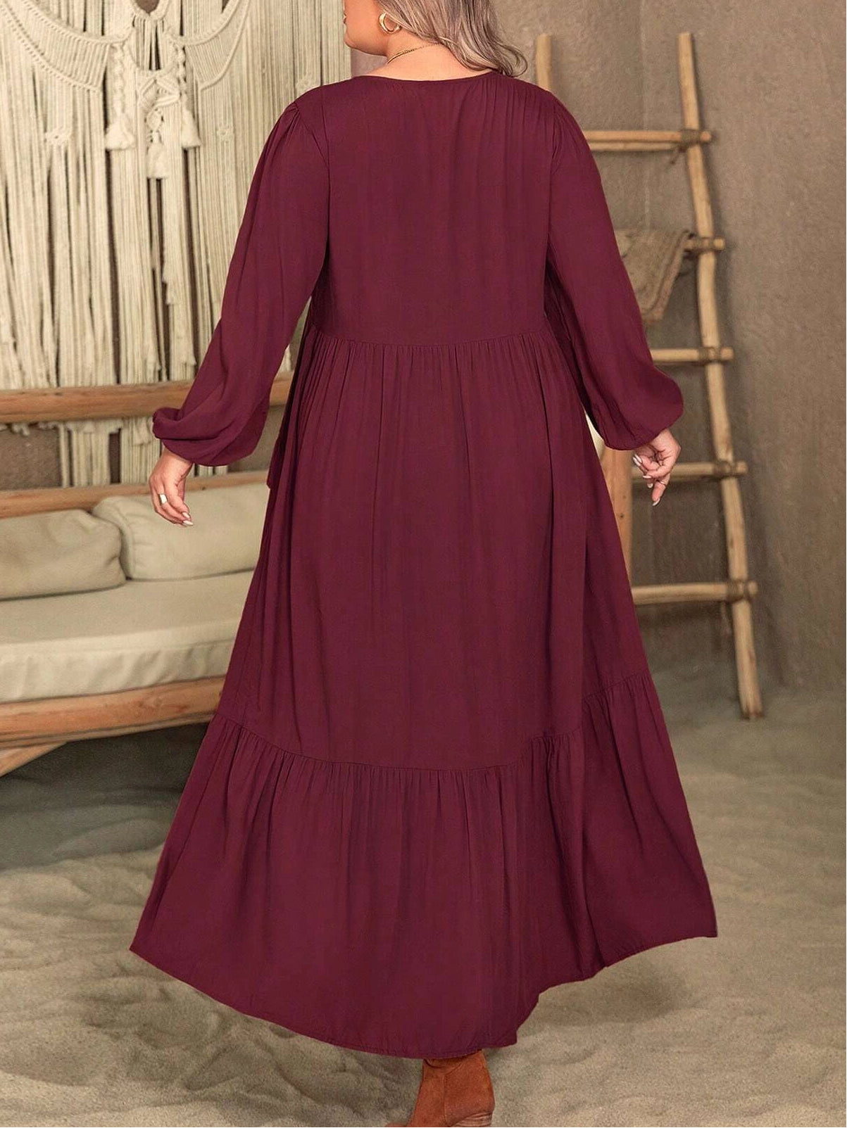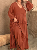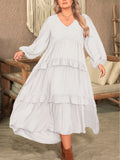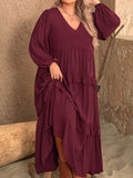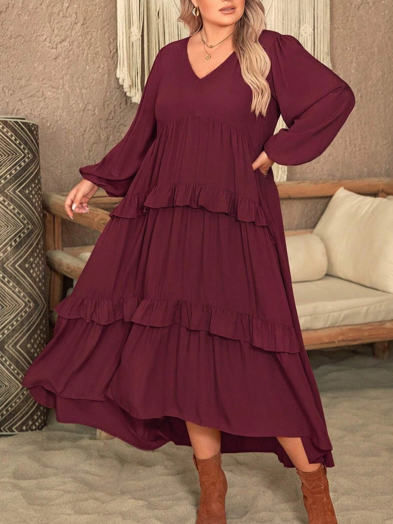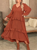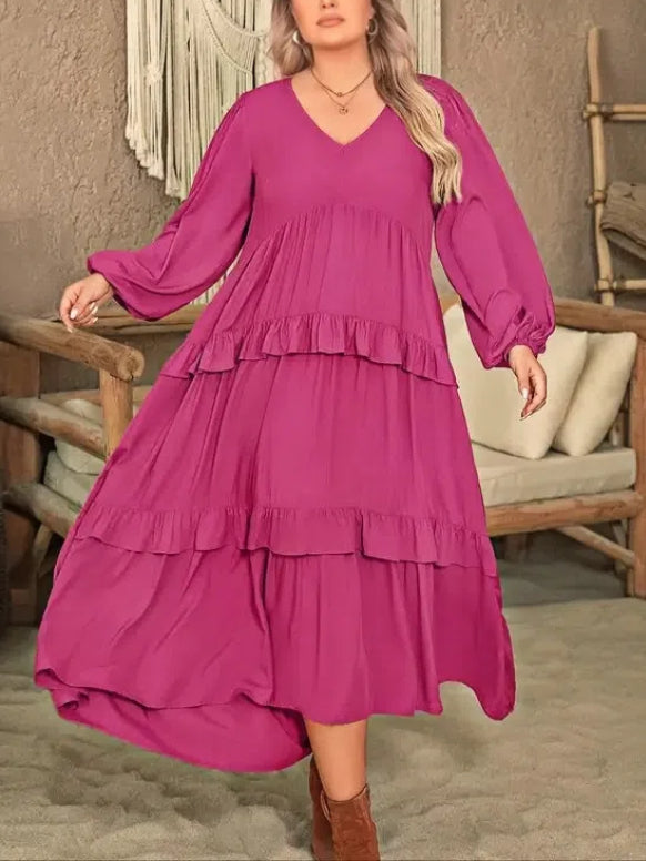 Elevate your wardrobe with this women's V-neck solid color long-sleeved dress, featuring elegant layered ruffles for a chic touch.