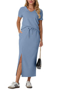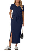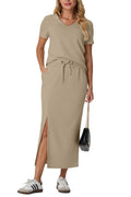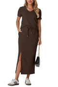 This dress set features a V-neck and short sleeves for a modern look. Elastic waist for easy on and off. Single side slit for added style and movement, with convenient side pockets. Suitable for most body types and activities. Pair with any shoe, add accessories, and jacket for colder weather.